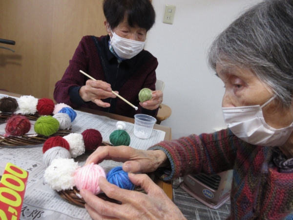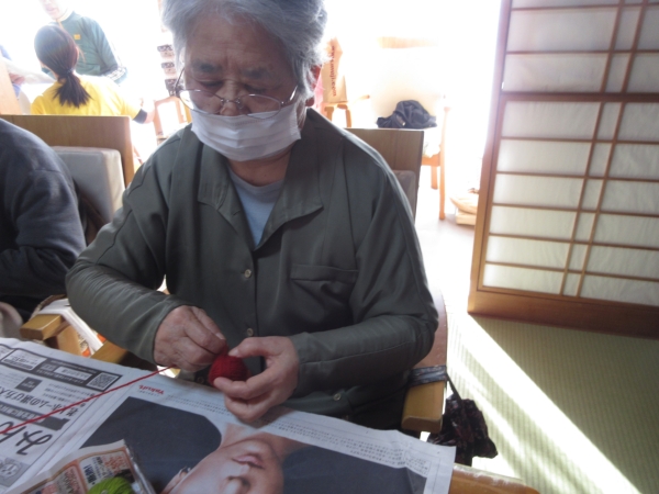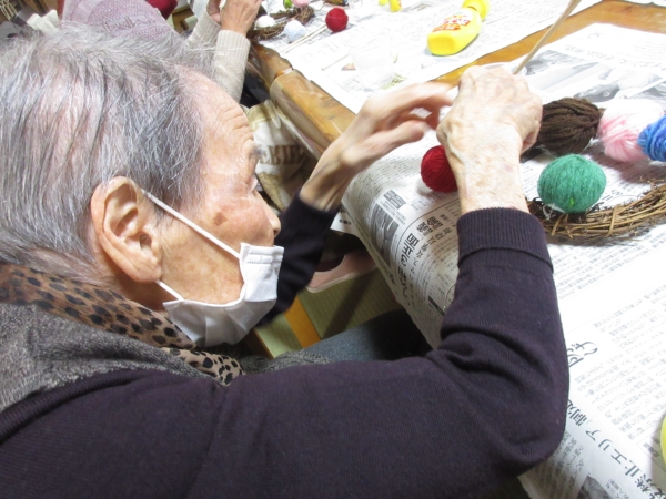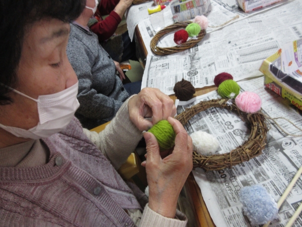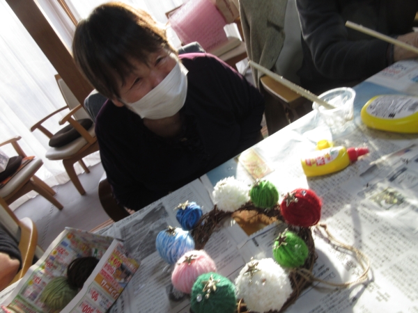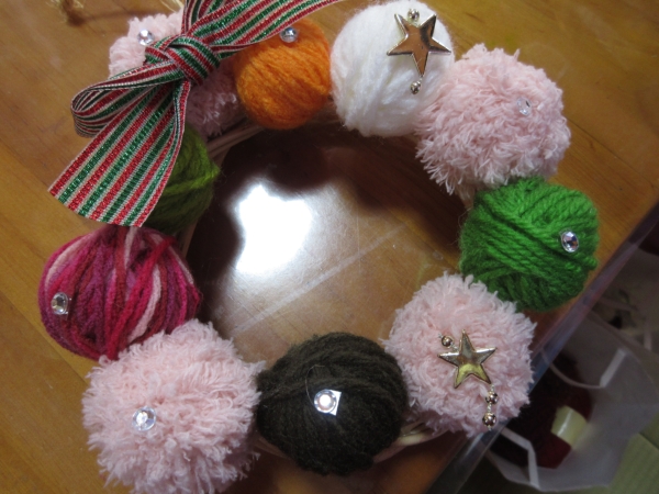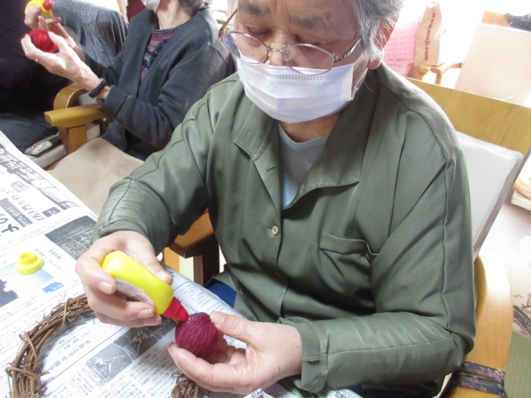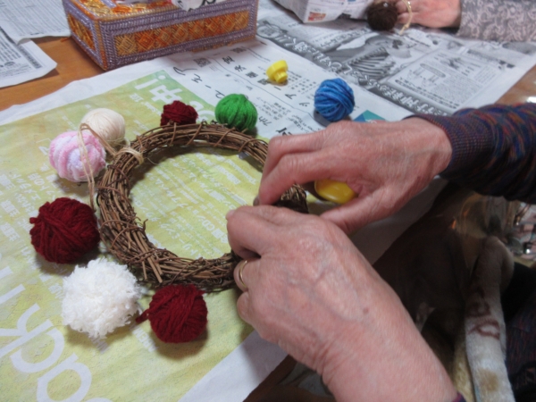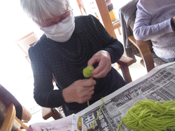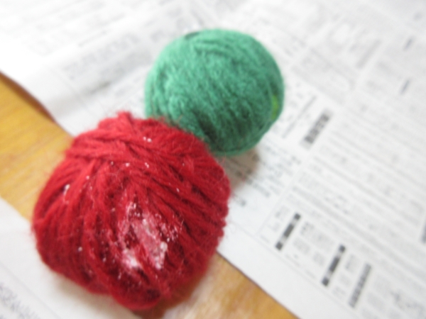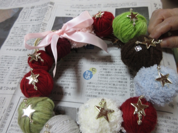 ボンドが乾くまで、毛糸玉を押さえて、くっつけて行きます