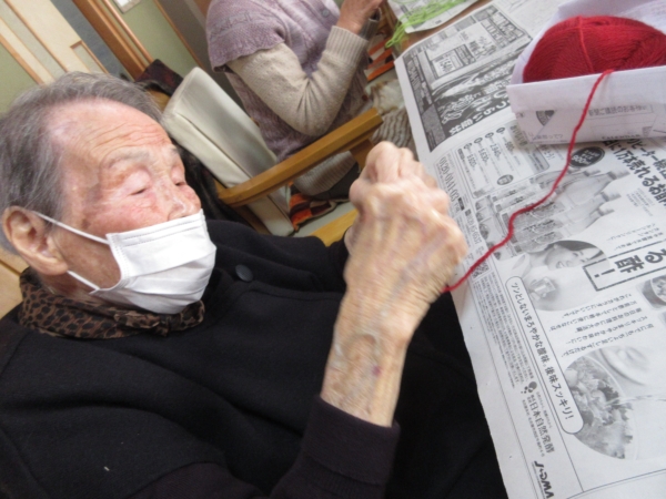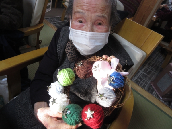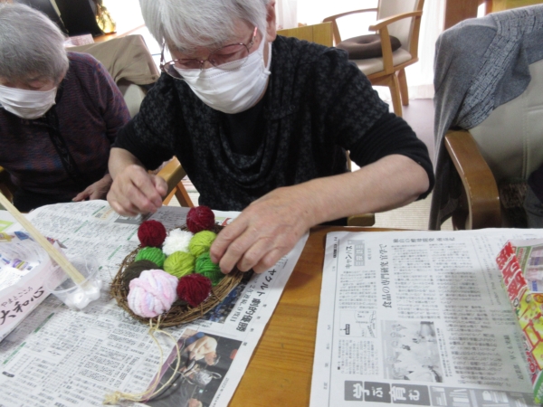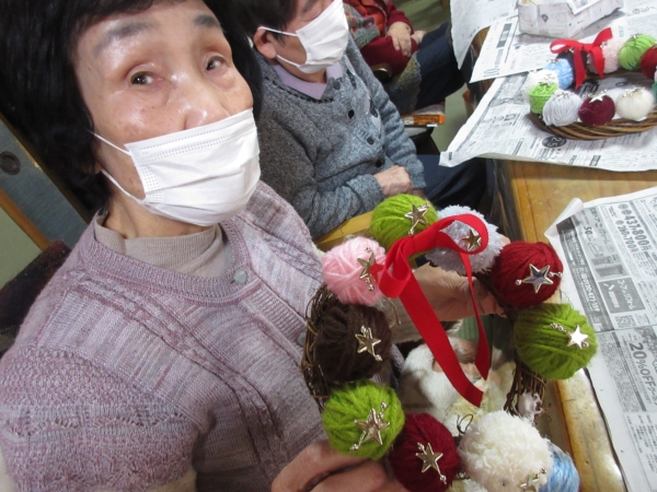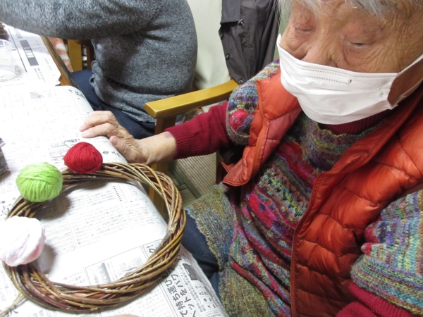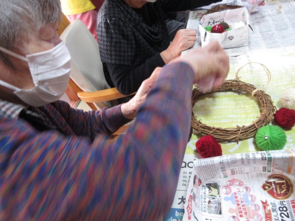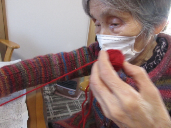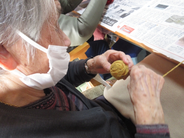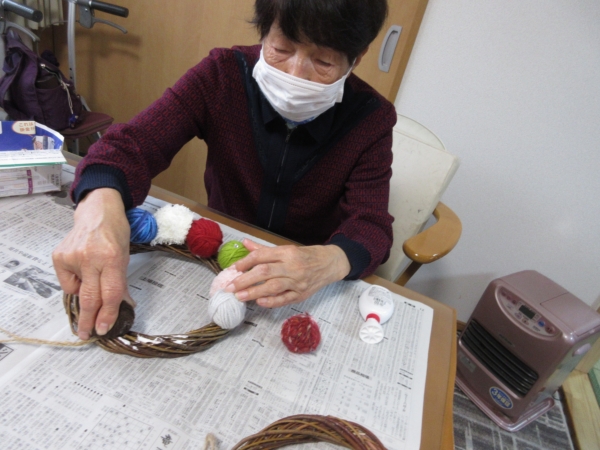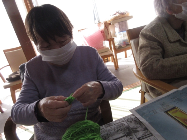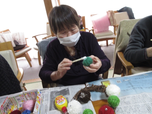 ボンドが乾くまで、毛糸玉を押さえて、くっつけて行きます