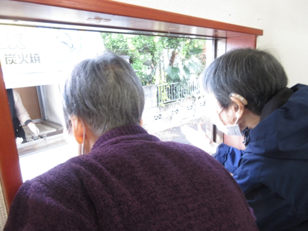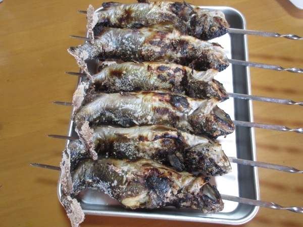 皆さんがつかみ取りしたニジマスを焼いてくださっています