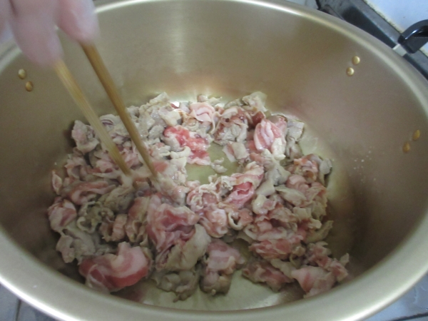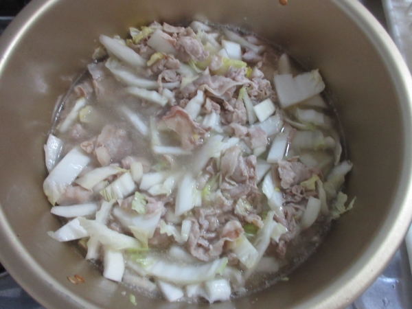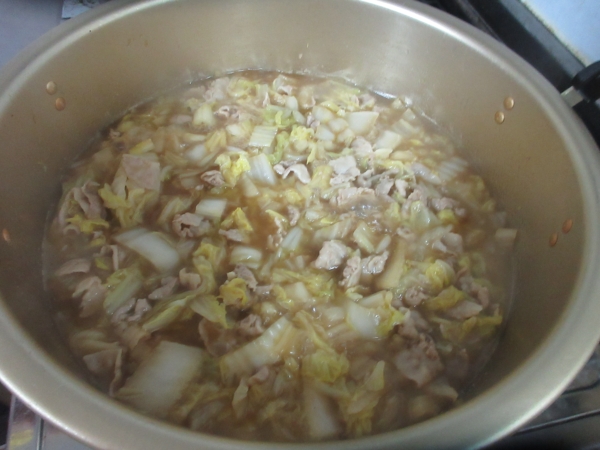 白菜の芯を加え更に炒め、水を加えて煮込んでいきます。