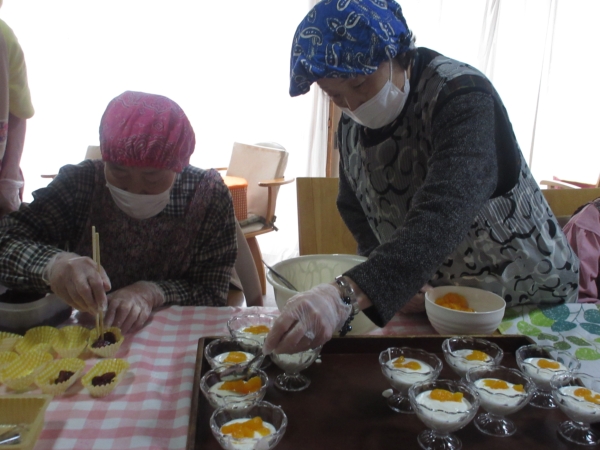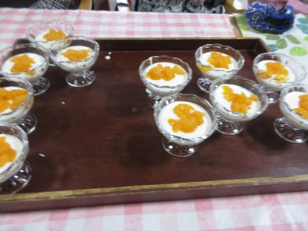 ヨーグルトを盛り付け、みかんを彩りに飾ります