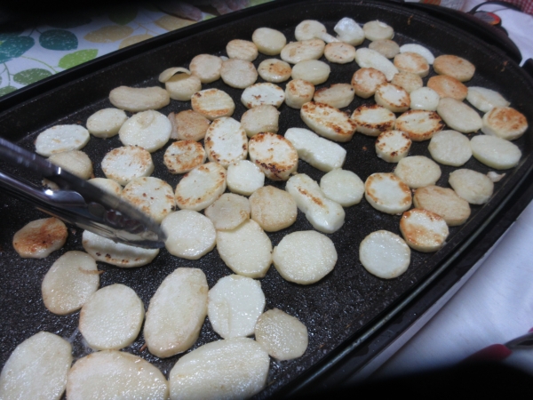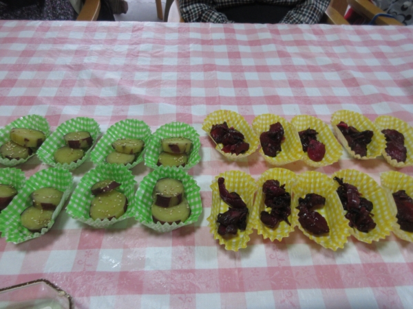 山芋のバター炒め、さつまいもの甘露煮、漬物をお皿に添えます。