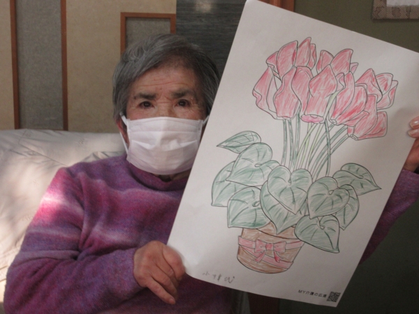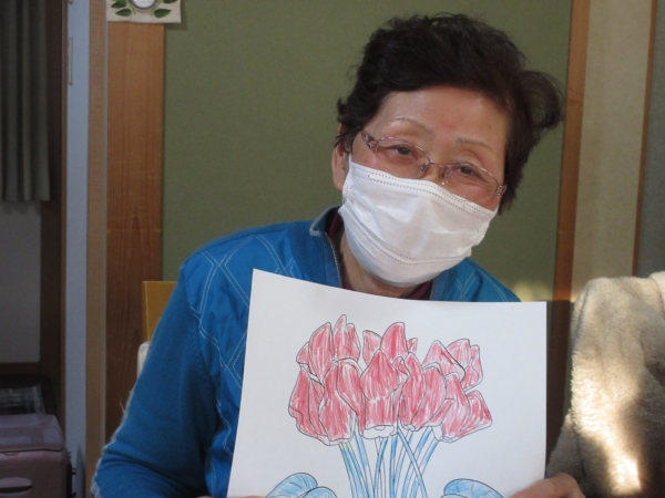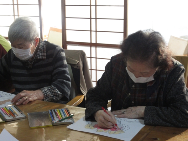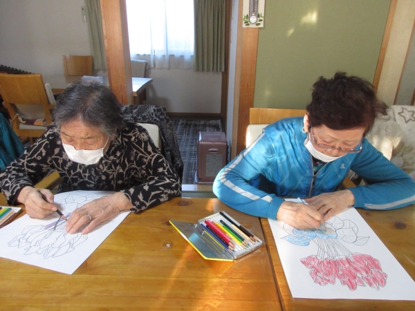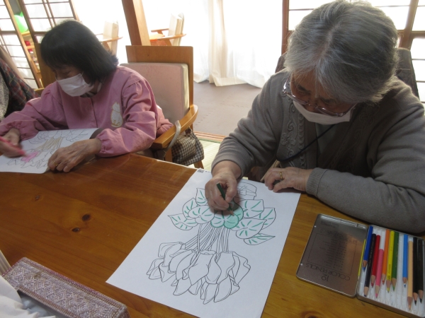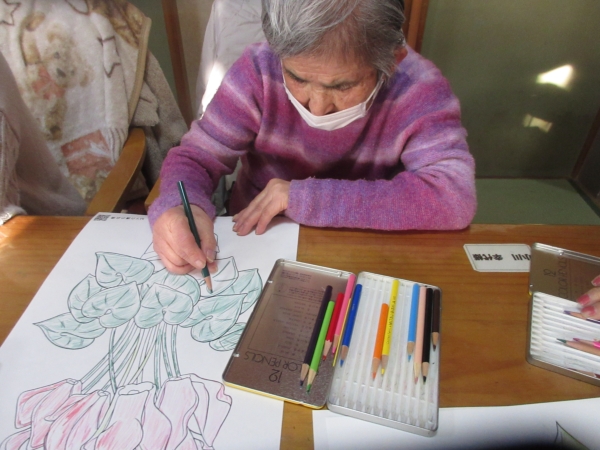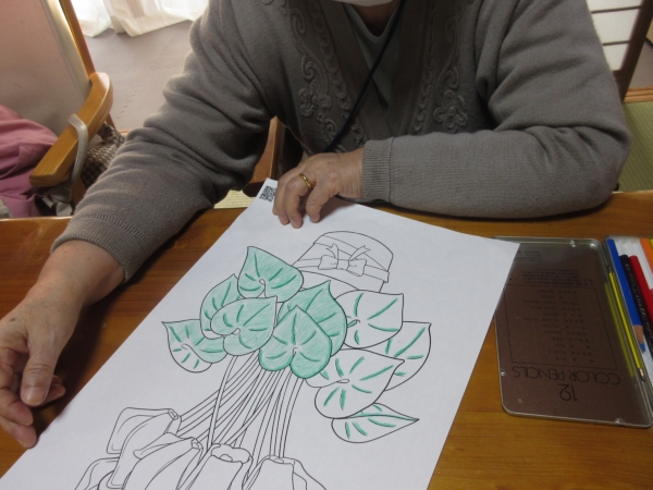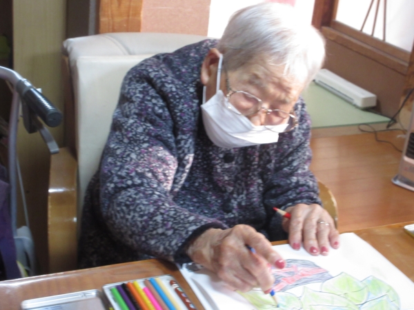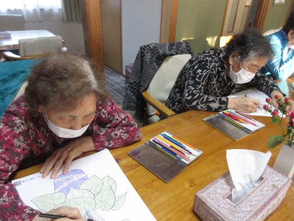 音楽を聞きながら、歌を口ずさんで塗り絵に集中する