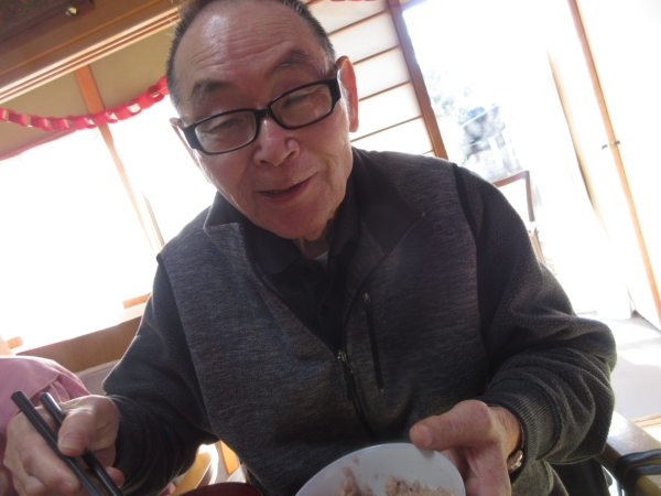 …とスタッフ山ちゃんが天ぷらを配りに皆さんの席を回ります。
