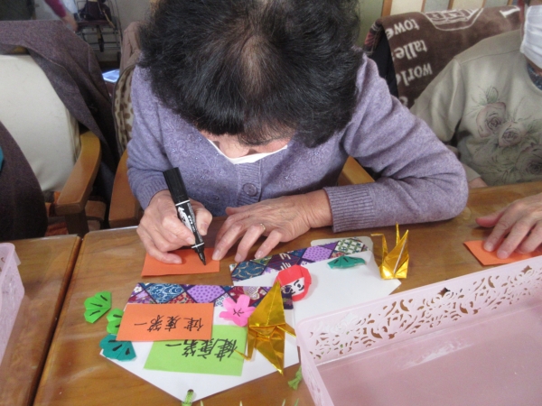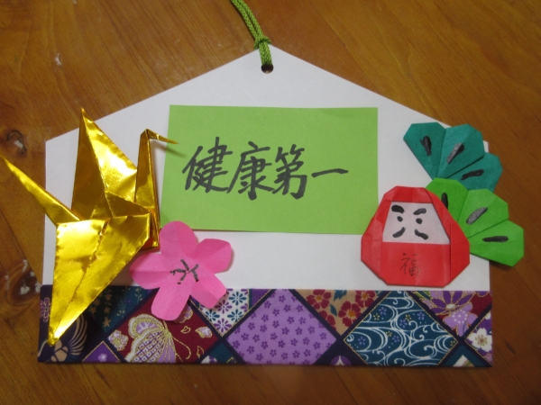 では、下準備が終わったところで、絵馬の板に折り紙と願い事を