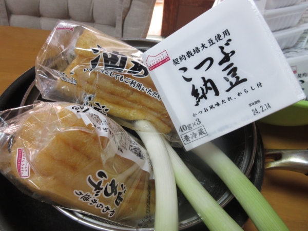 刻んだネギと納豆を混ぜて、油揚げに包みます