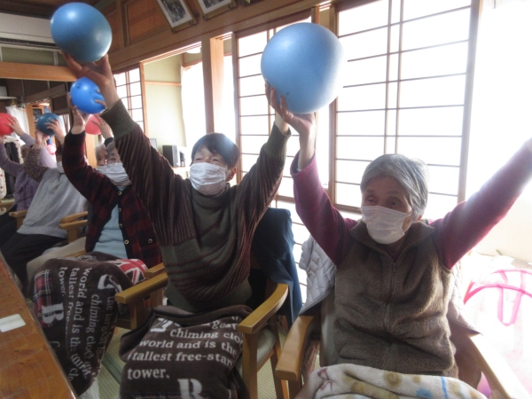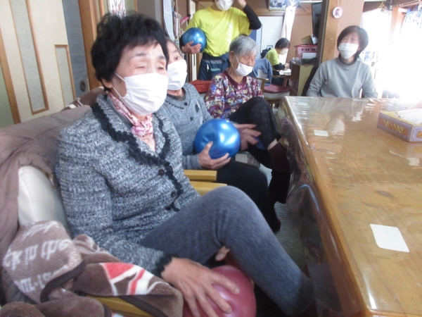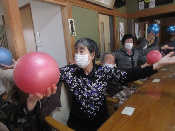 ボールを持って腕を開いて閉じてと腕の可動域訓練です
