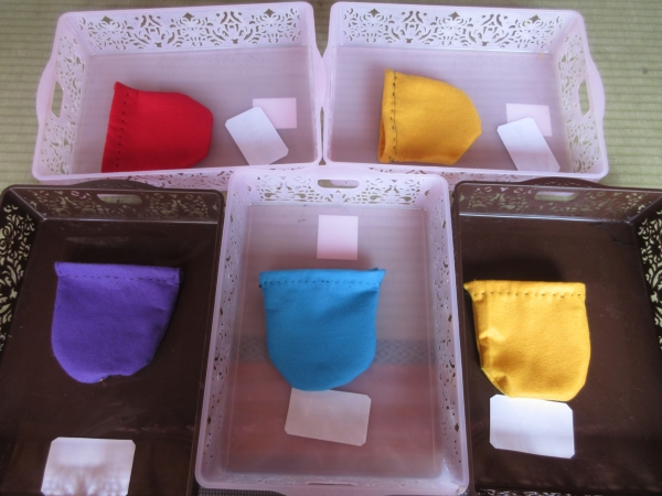 赤や黄色、紫に水色と色とりどりの袋が出来上がりました指でOK指でOK指でOK