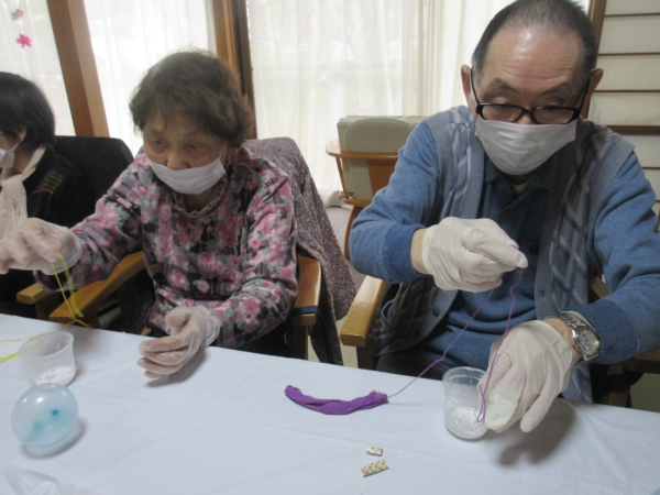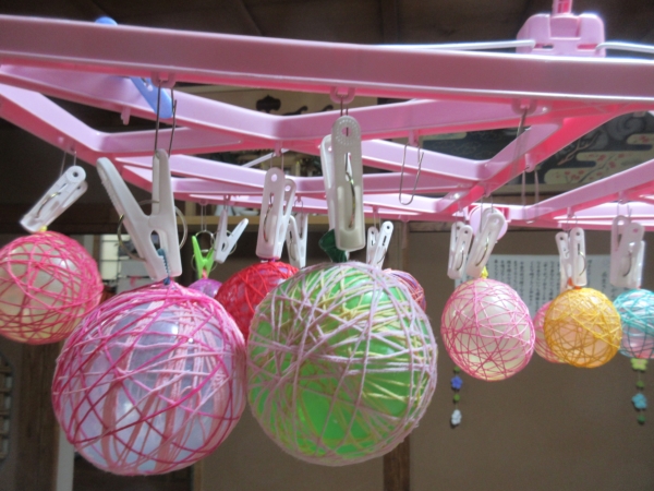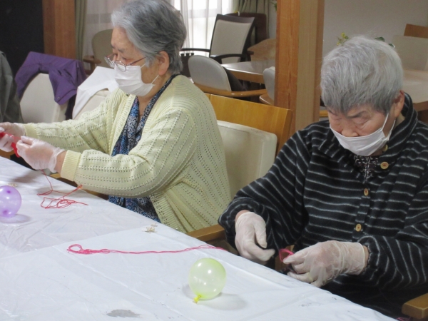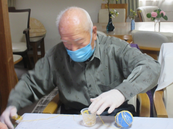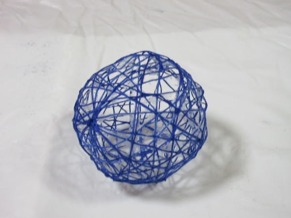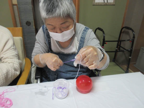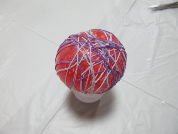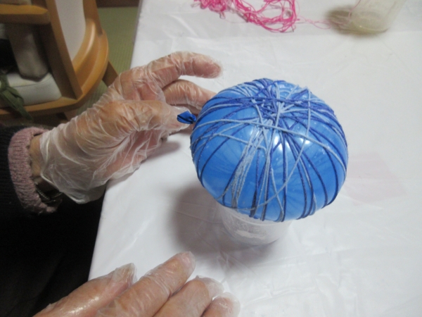 ほどいた刺繡糸をボンドに付けて、風船にらせん状に巻き付けていきますよ~