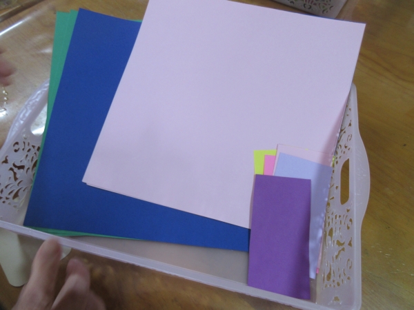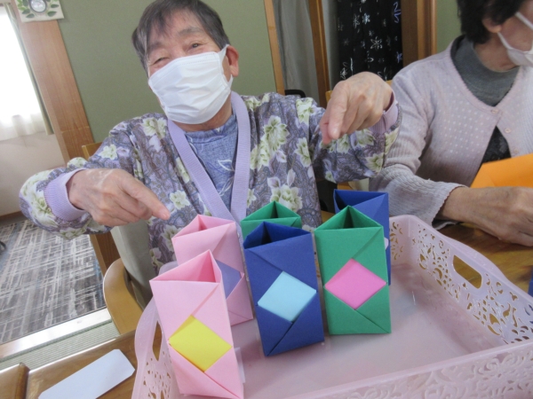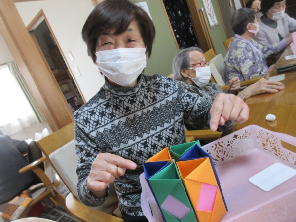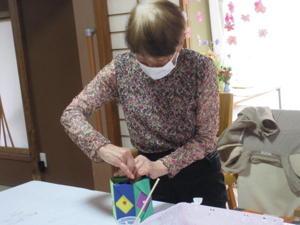 母、一人、一人に準備されたカゴの中には作品の材料が