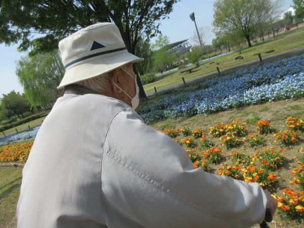 帰り際もお花が気になる父うれしい顔ハートたち (複数ハート)