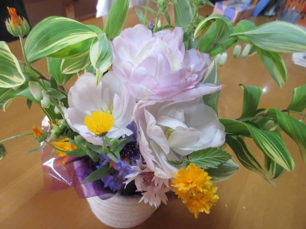ご利用者様がフラワーアレンジメントを持って来て下さいましたうれしい顔ハートたち (複数ハート)