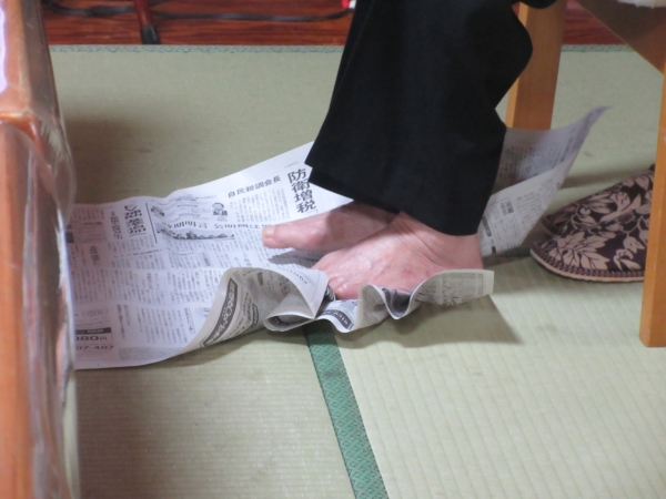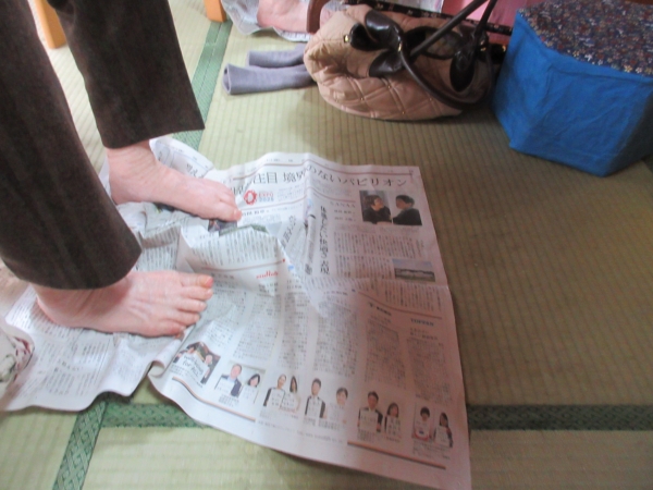 次は、足の指を使って新聞紙を手前にたぐり寄せていきます