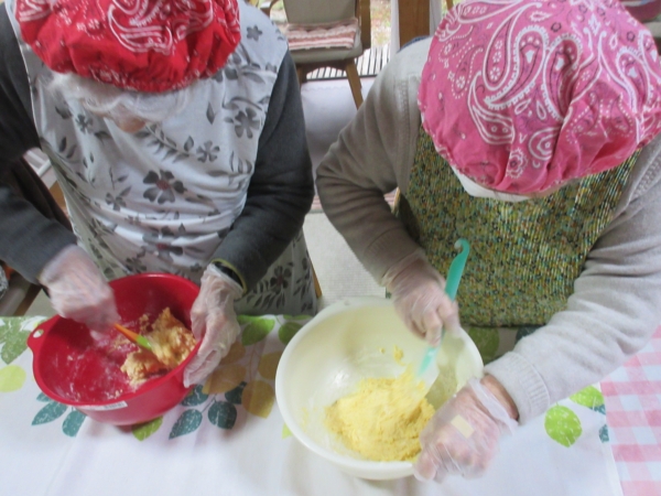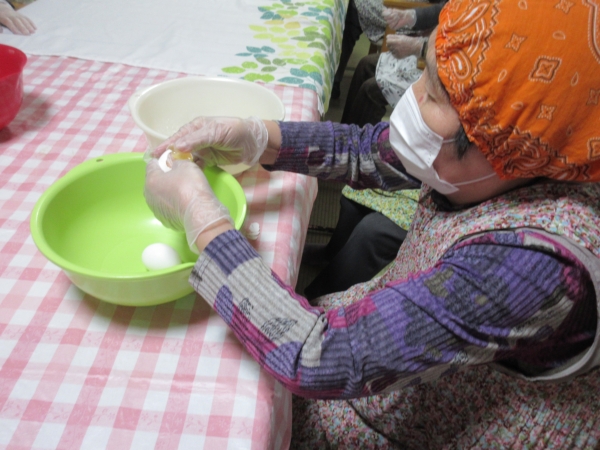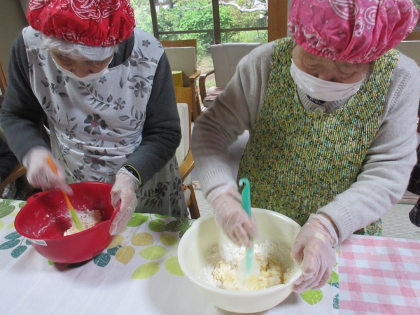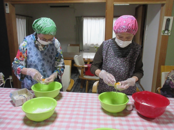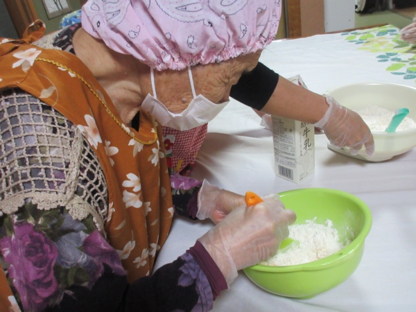 ホットケーキミックスに卵黄と牛乳を加え、混ぜ合わせますよ。