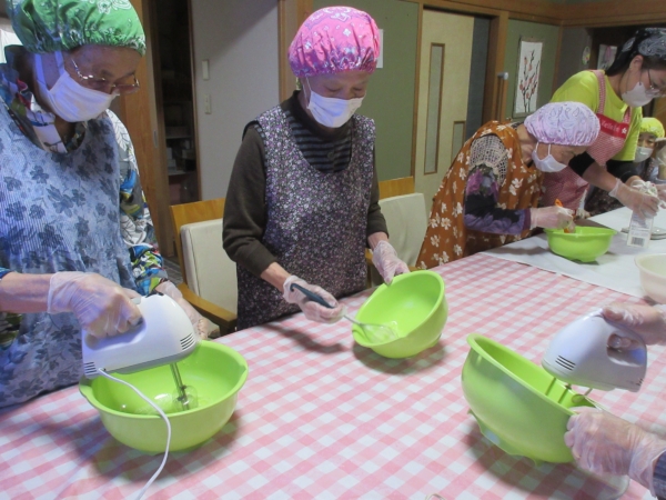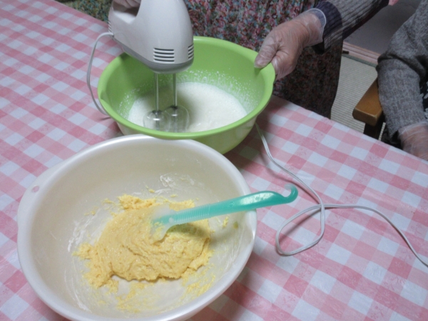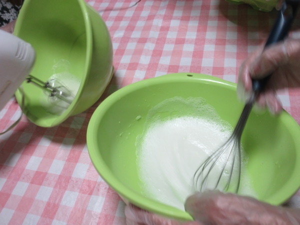そして卵白は、泡だて器でメレンゲを作っていきます