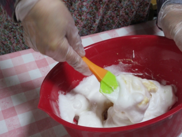 生地にメレンゲを加え、切るように混ぜ合わせます