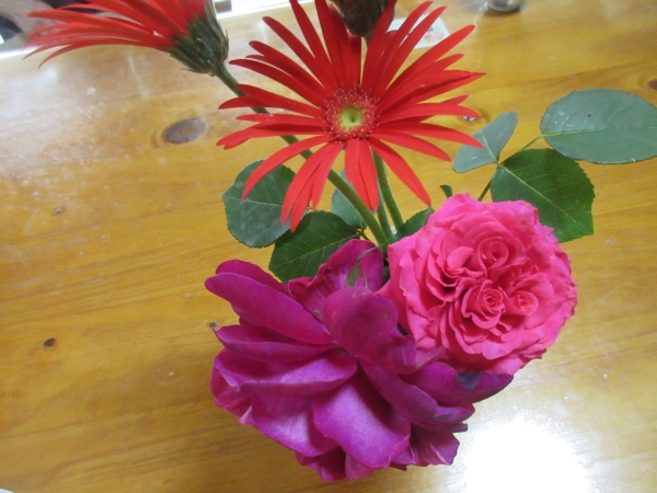 幸せの幸望庵の庭に、綺麗なガーベラと薔薇が咲いていました
