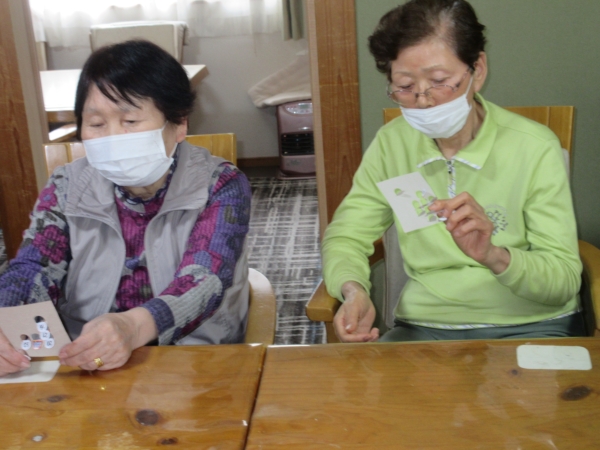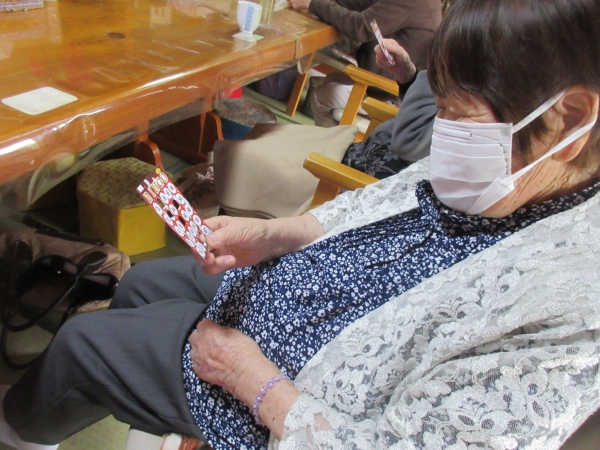 番号を読み上げると、ビンゴカードとにらめっこの母達