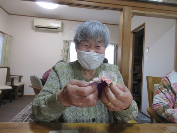 お花を縫い付けて華やかにしていきますよ目がハート (顔)ハートたち (複数ハート)