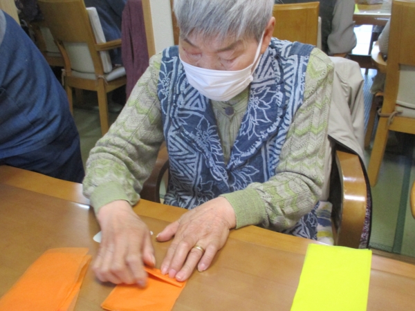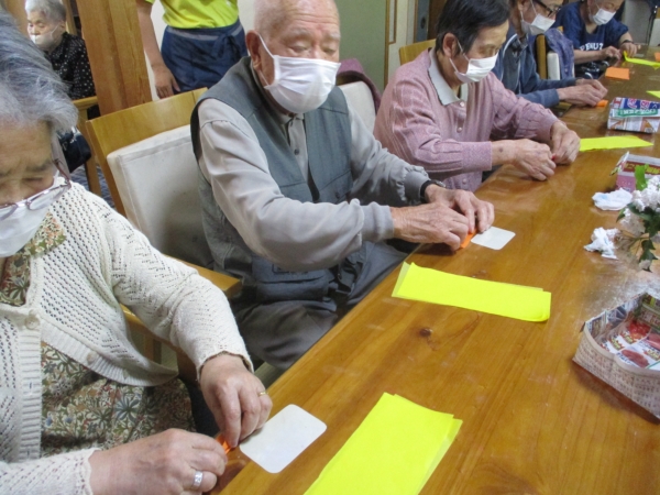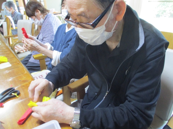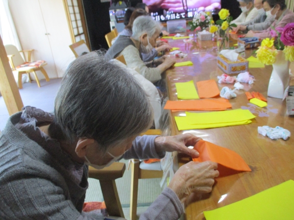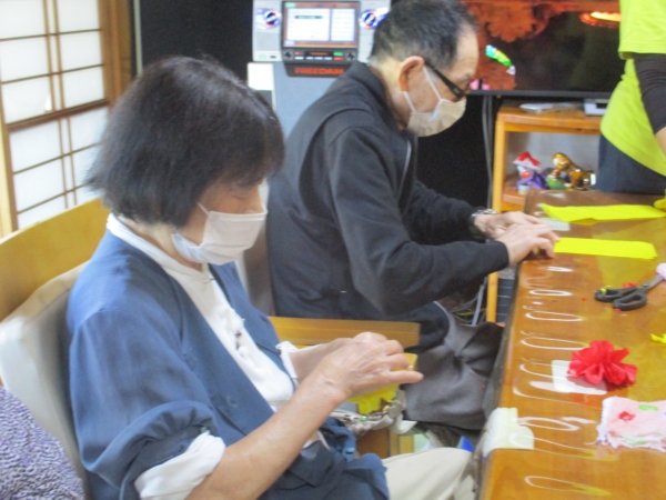 お花紙を半分に切って、ジャバラ折にしていきますよ