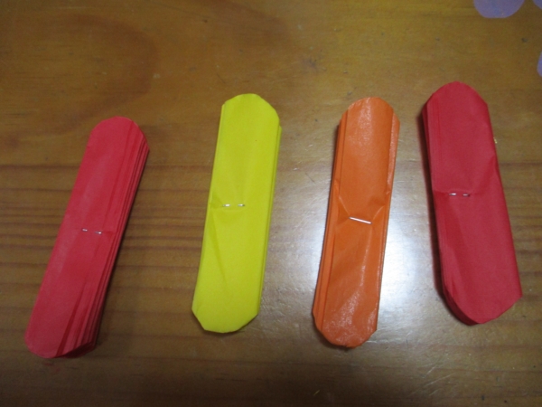 ジャバラに折れたら、中心をホチキスで止め、両端を丸くカットします✂