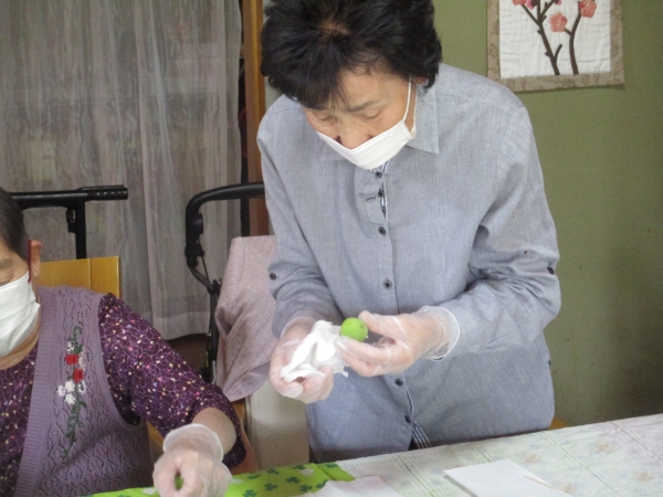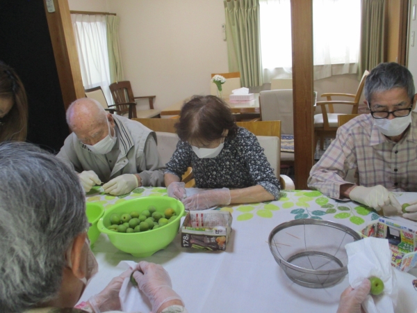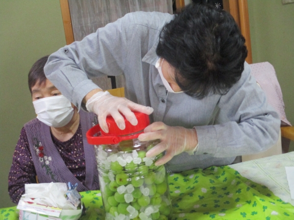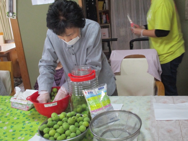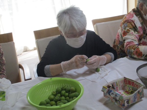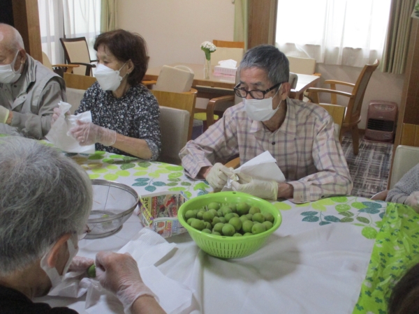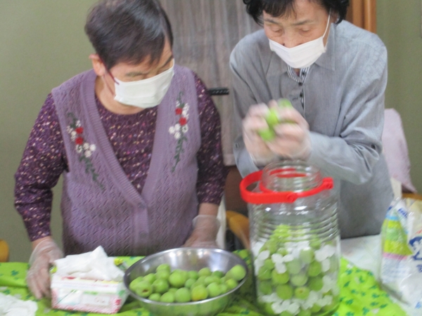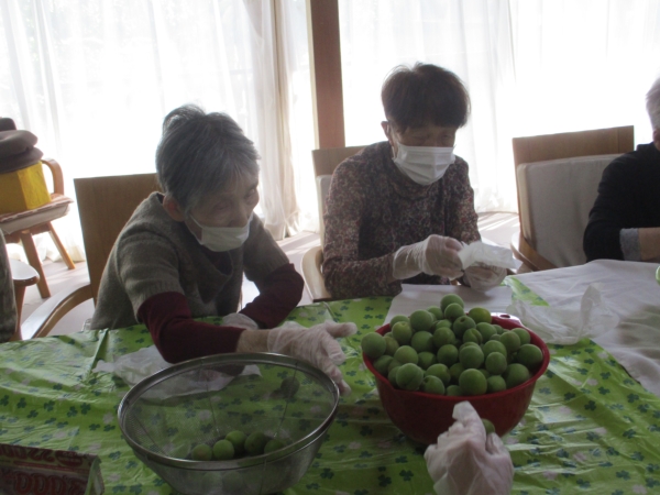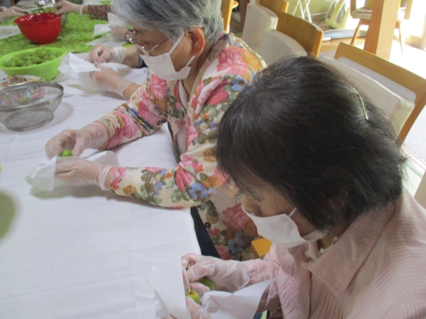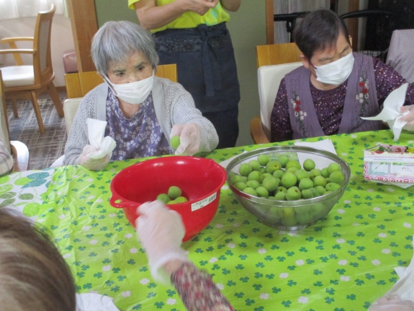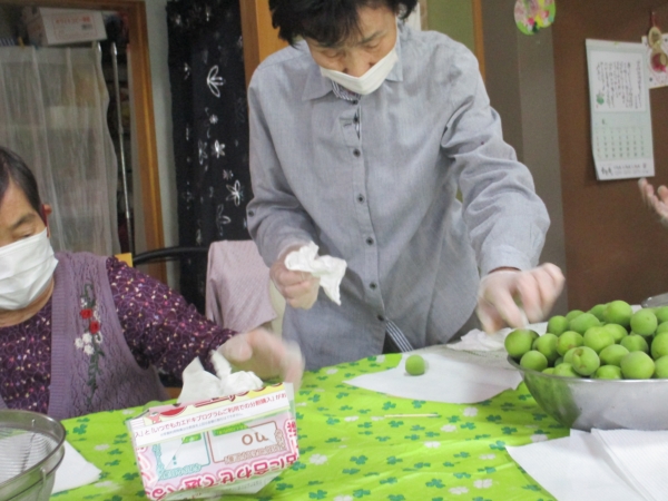 ひとつひとつ梅をキッチンペーパーで拭いていきますほっとした顔揺れるハート