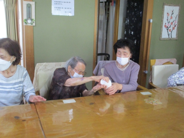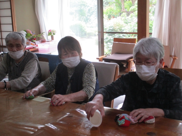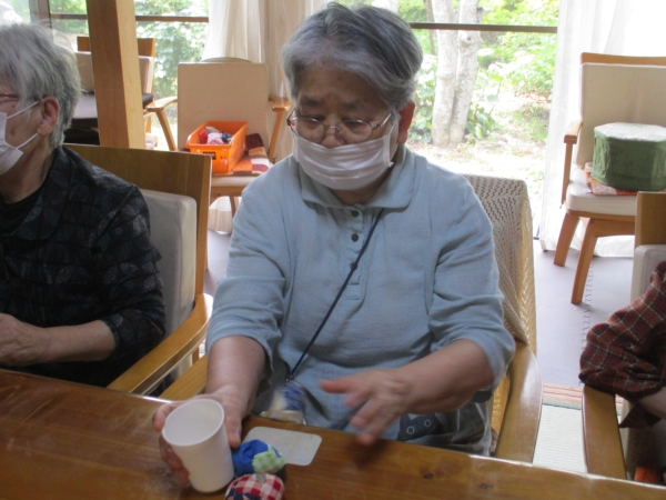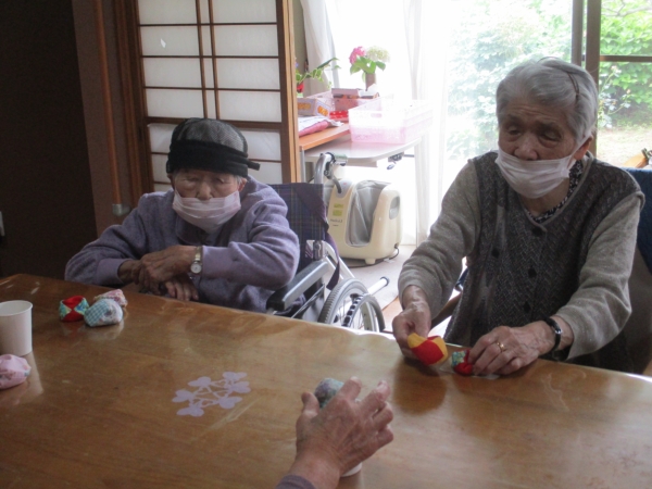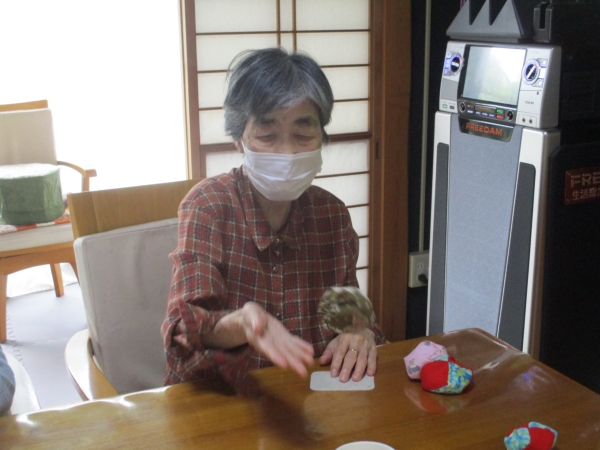 今日は、スタッフ関ちゃんの「お手玉」を使った脳トレを行います