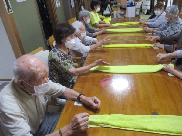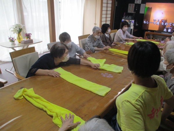 タオルを中央に置いて、相向かいの方とジャンケンをします。