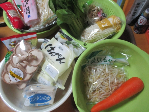 白菜、人参、ニラ、きくらげ、かまぼこに厚揚げ等々