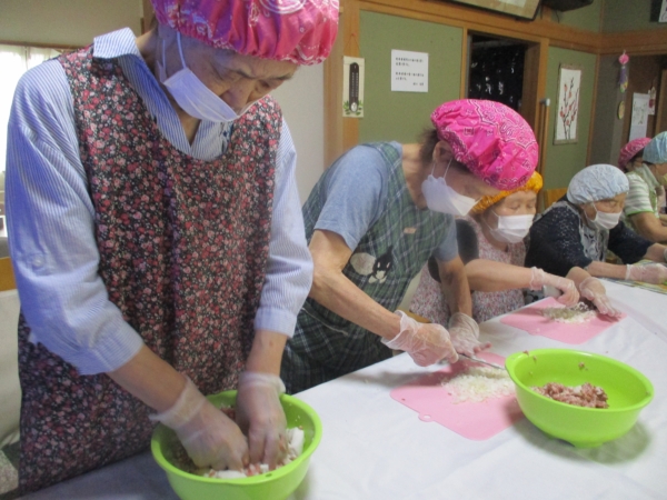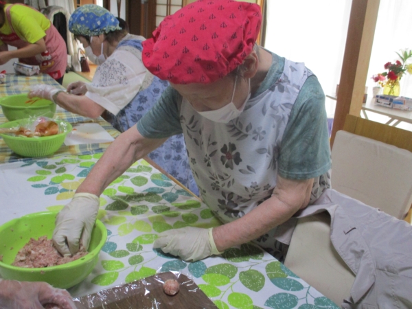 みじん切りにした玉葱とひき肉に調味料を加え、練り込みます。