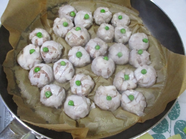 フライパンにクッキングシートをひいて、焼売をのせて蒸し上げます