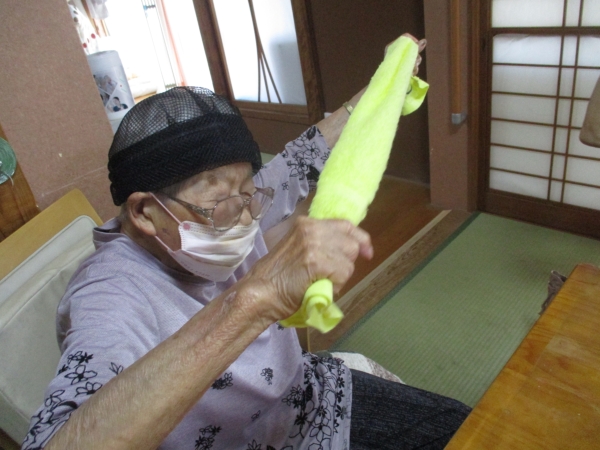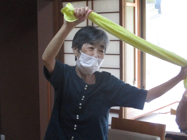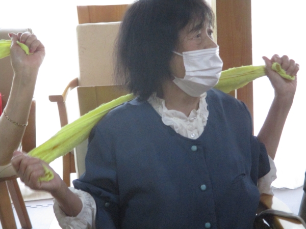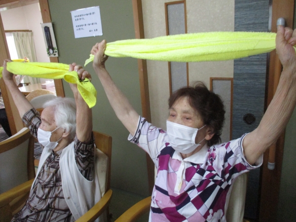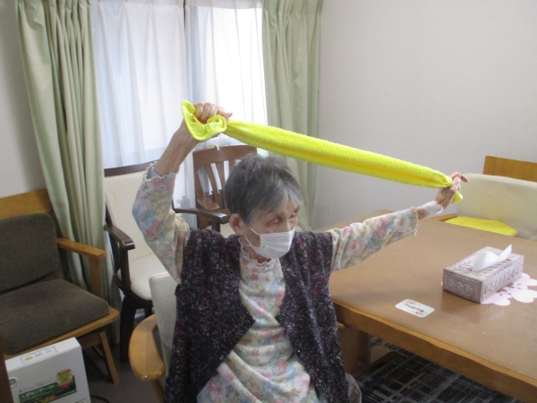 タオルを膝に掛け、足を動かしてタオルを床に落としていきます