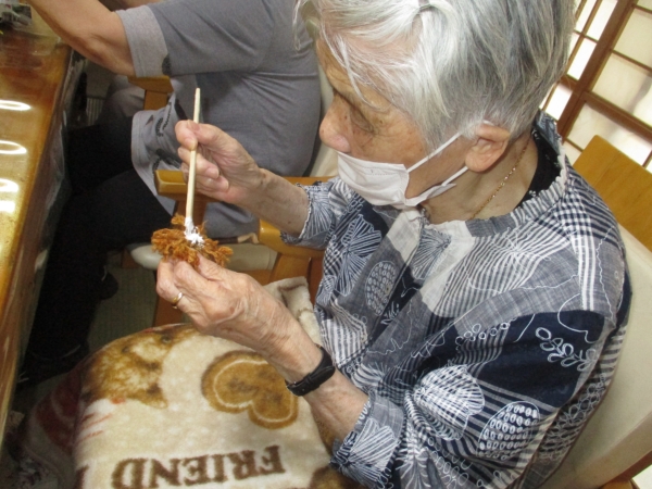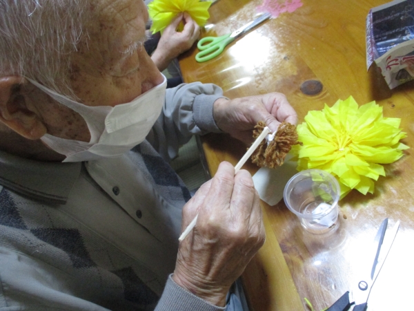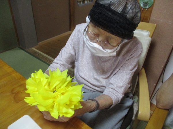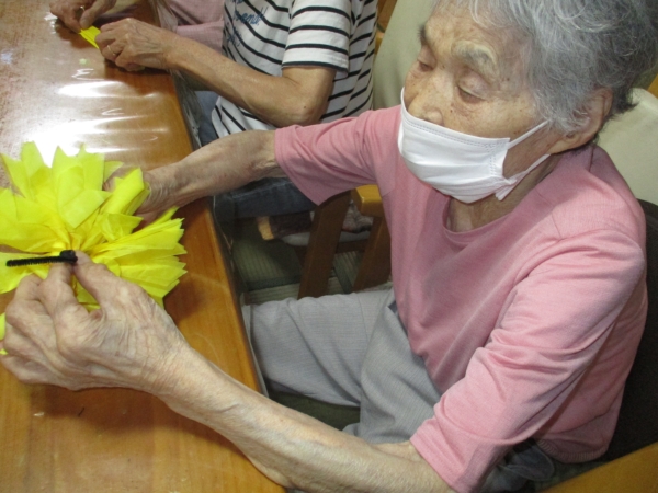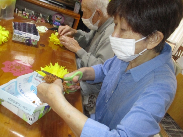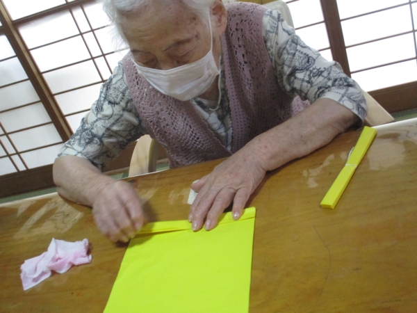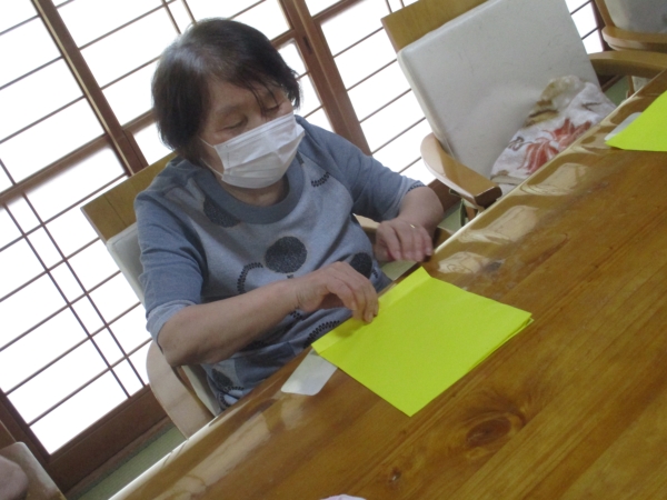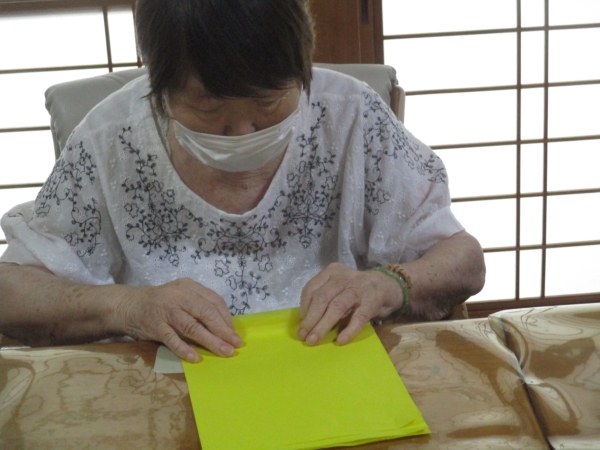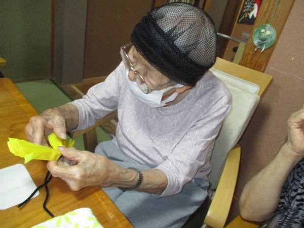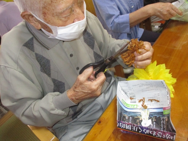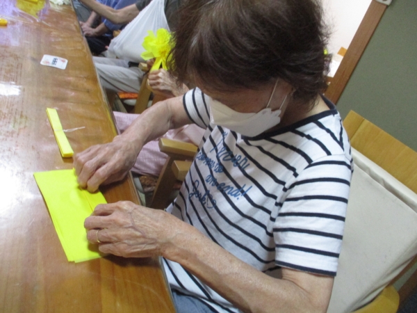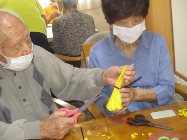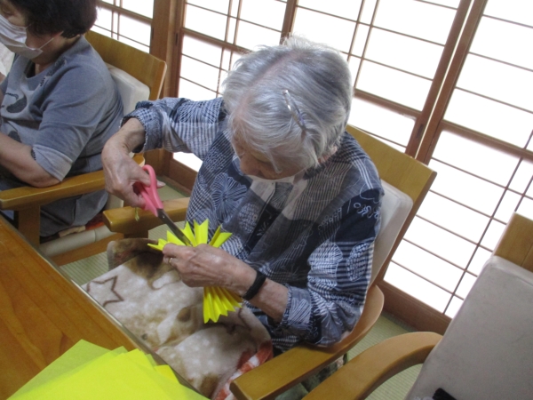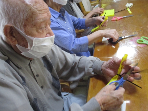 蛇腹折りにしたら、中心を止めて角をハサミでチョキチョキ