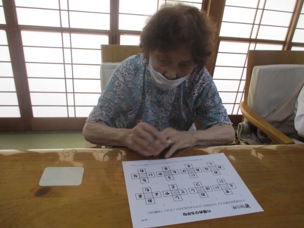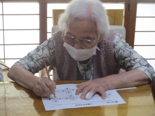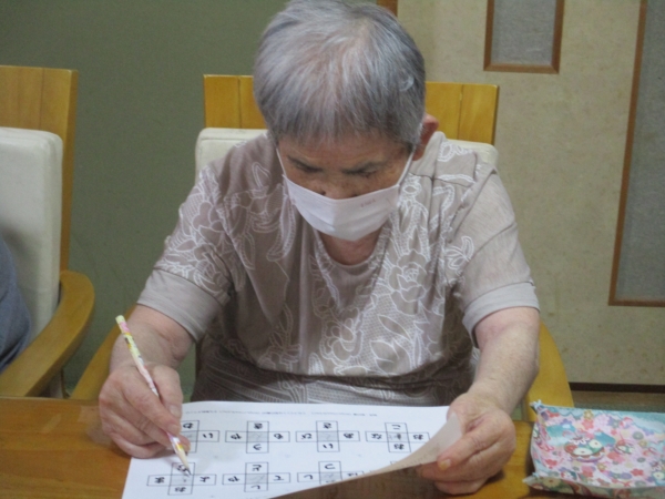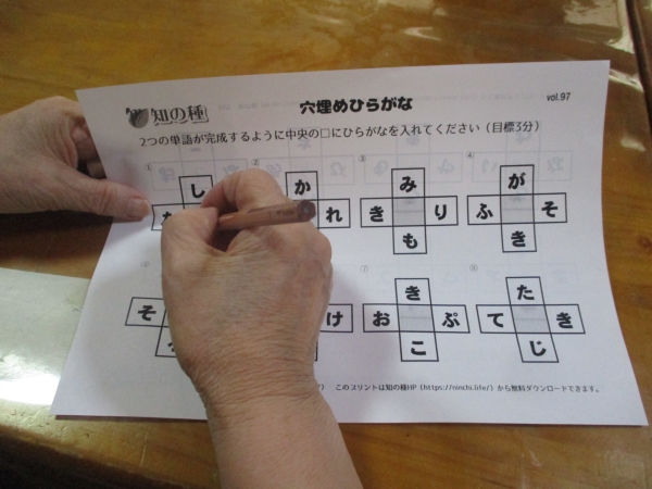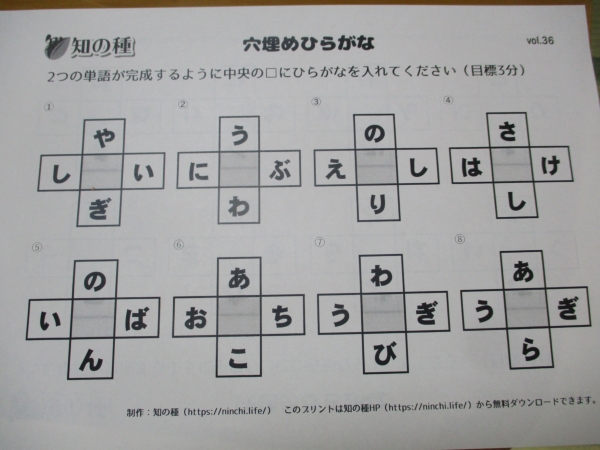 中央の▢にひらがな1文字を入れて、縦・横3文字の言葉を作ります。