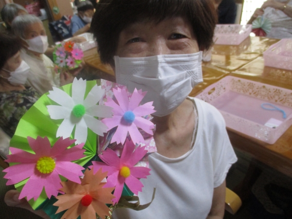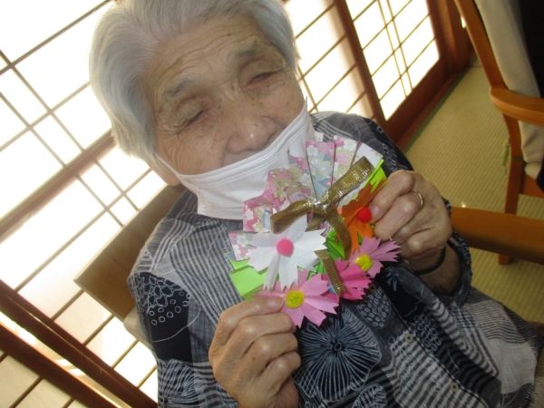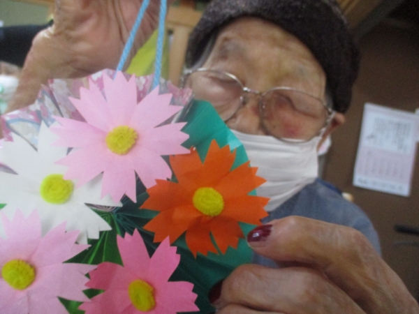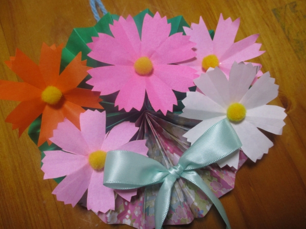 完成したコスモスのリースを見せて下さいましたうれしい顔ハートたち (複数ハート)