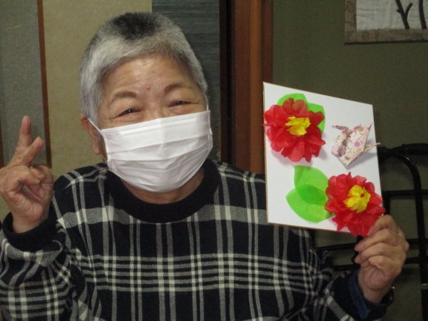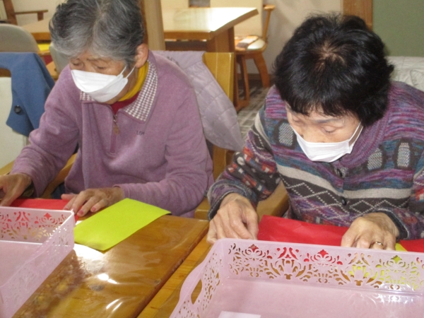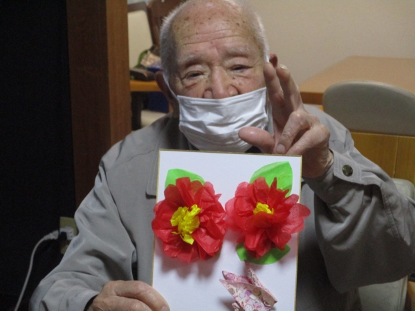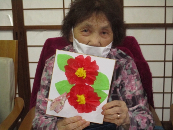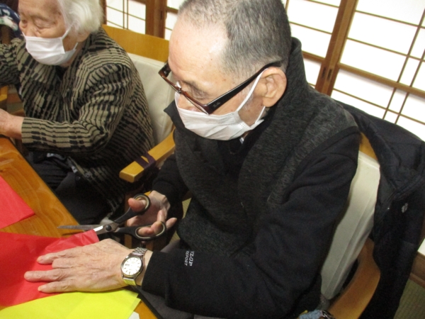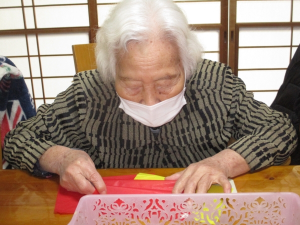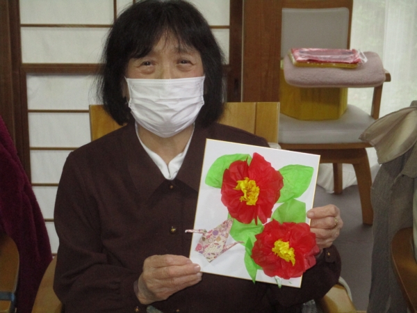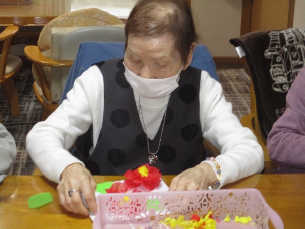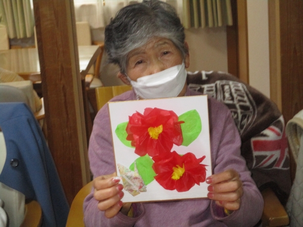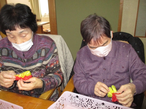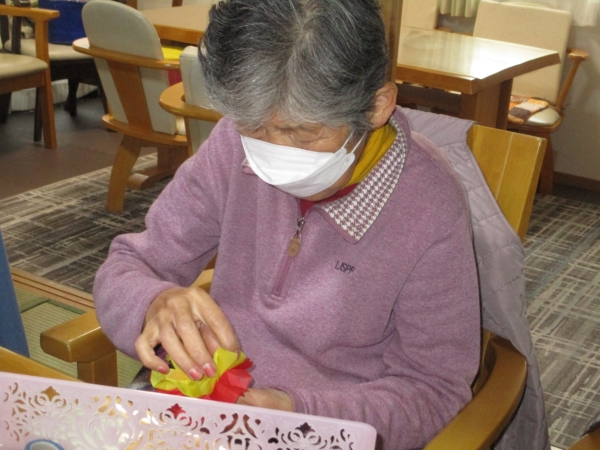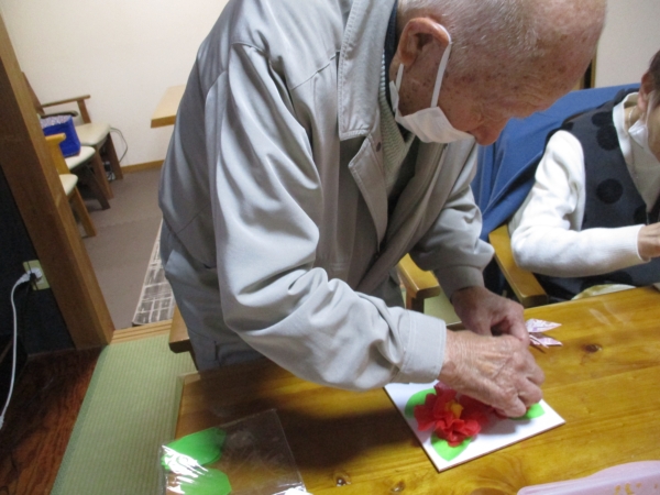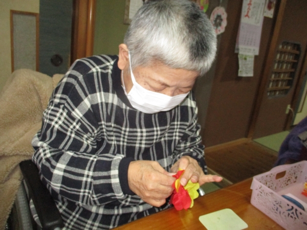 本日の手工芸は赤と黄色のお花紙を使った作品作りを