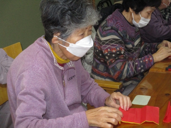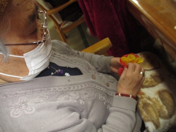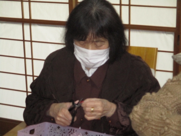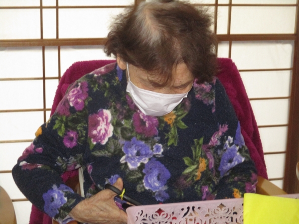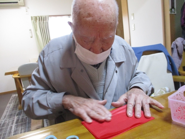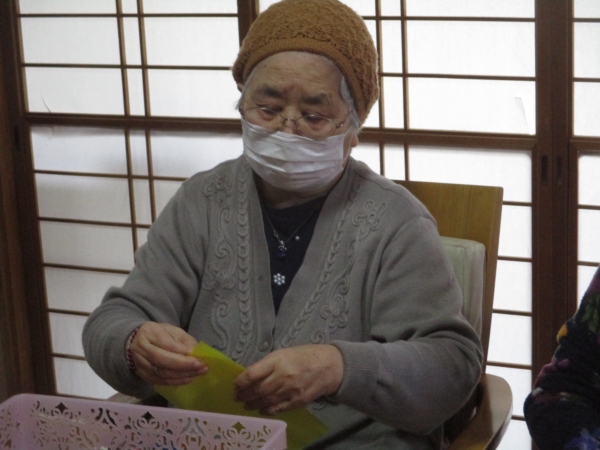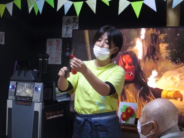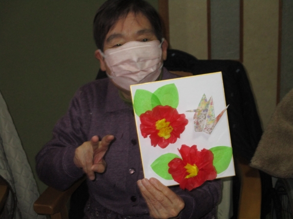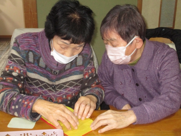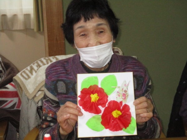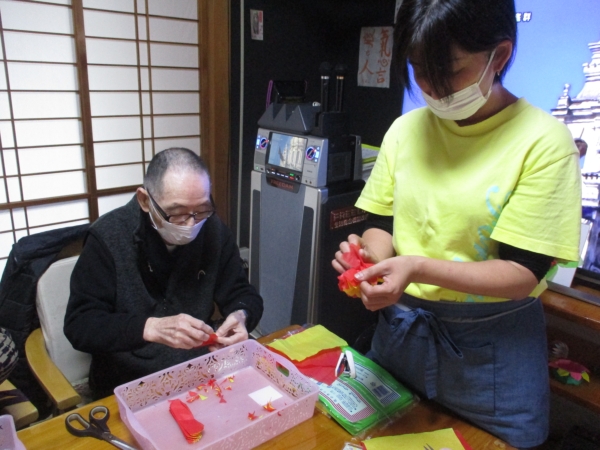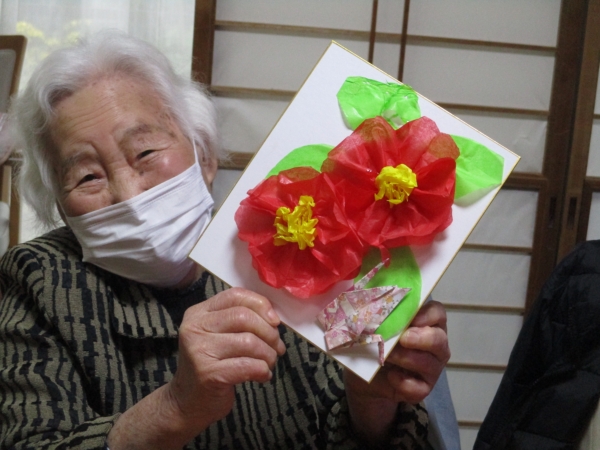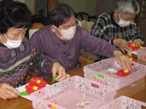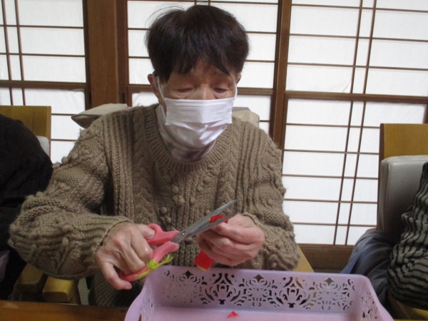 本日の手工芸は赤と黄色のお花紙を使った作品作りを