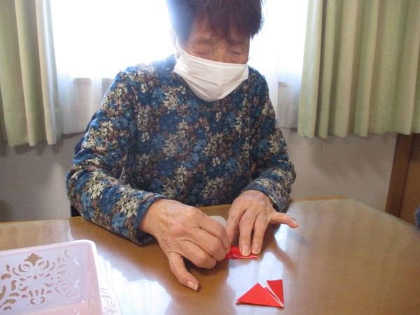 折った部分の片側に糊をつけ、交差するようにクルッと丸めると~