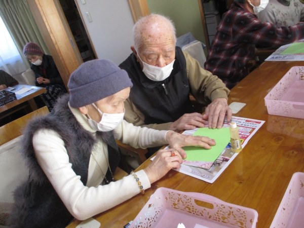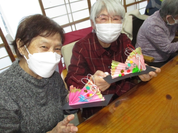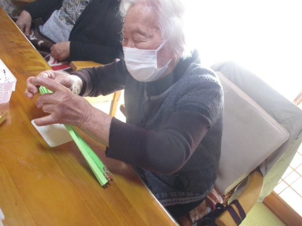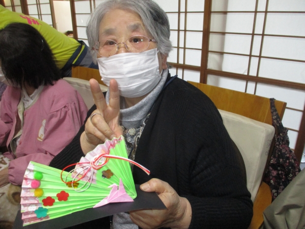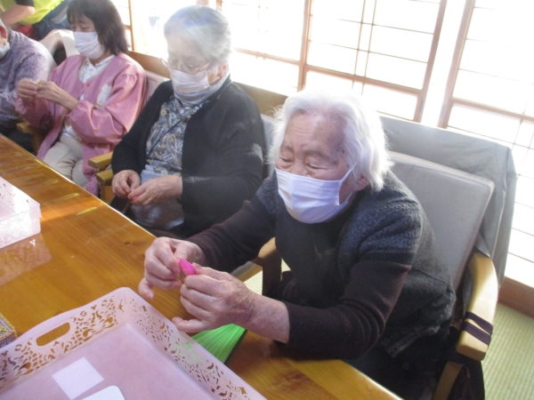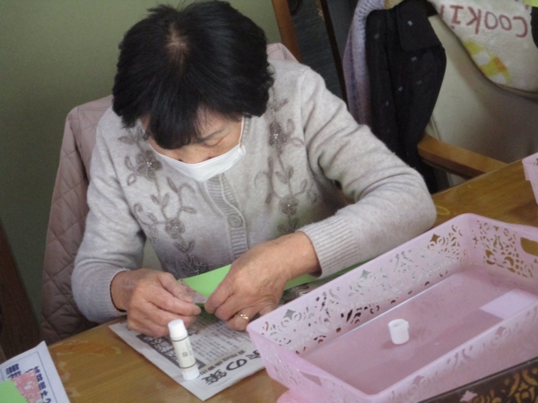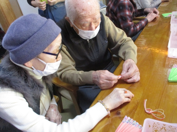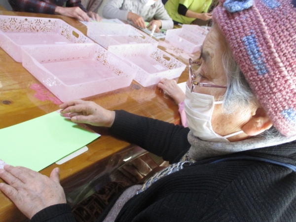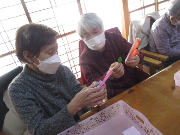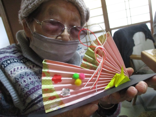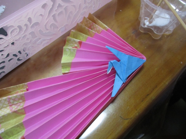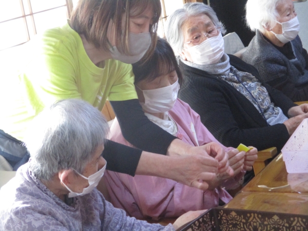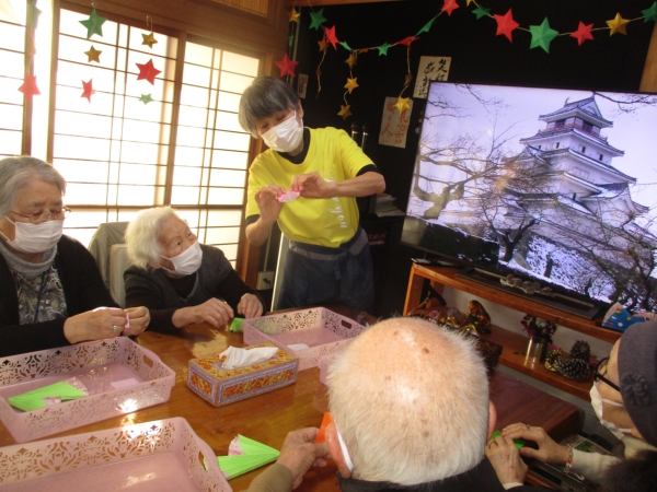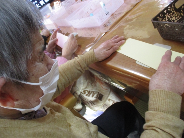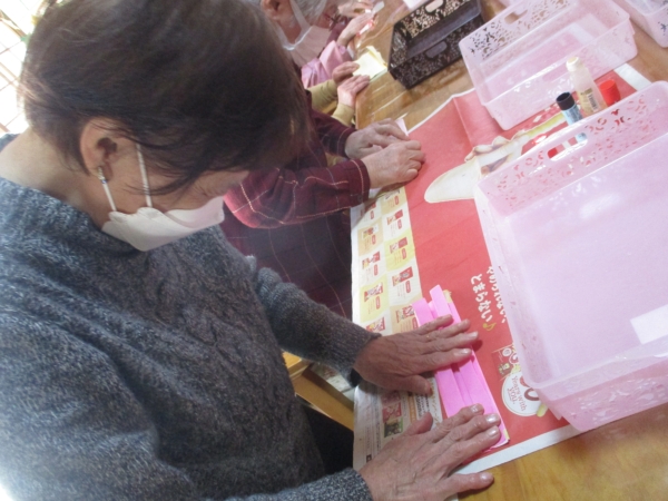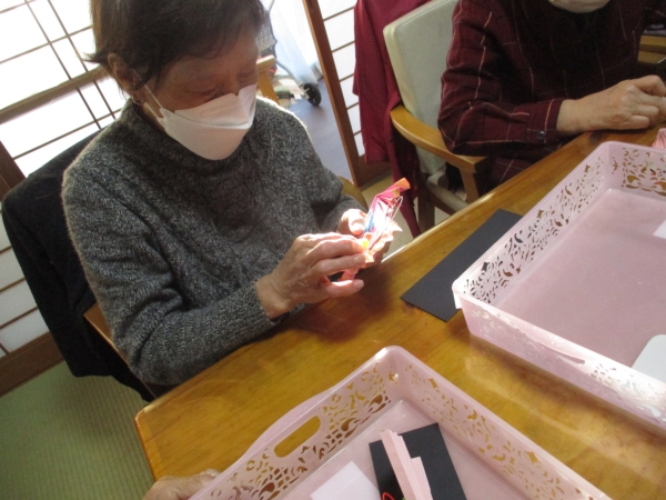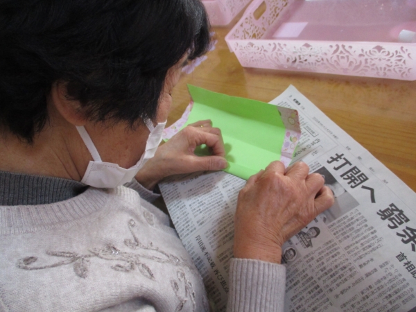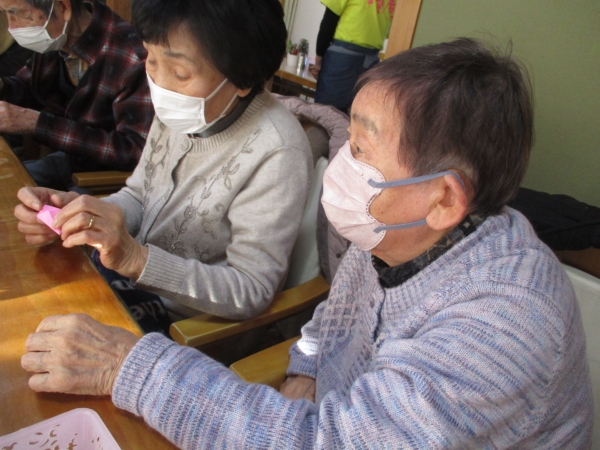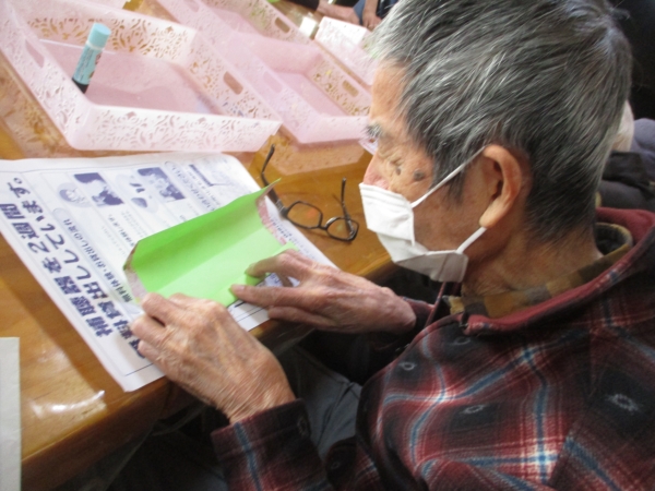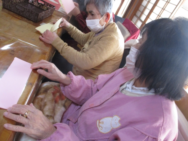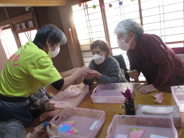スタッフ関ちゃんに、折り方を教わりますうれしい顔ハートたち (複数ハート)