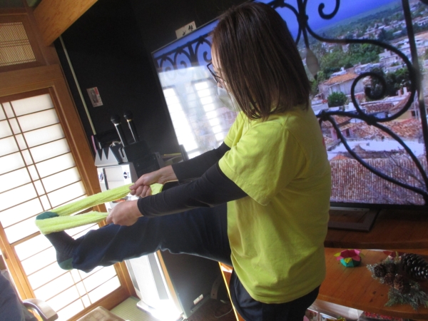 タオルを使ってしっかり身体を伸ばしていきました