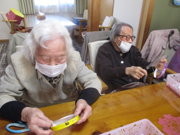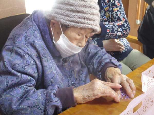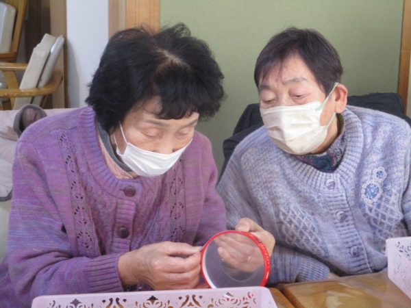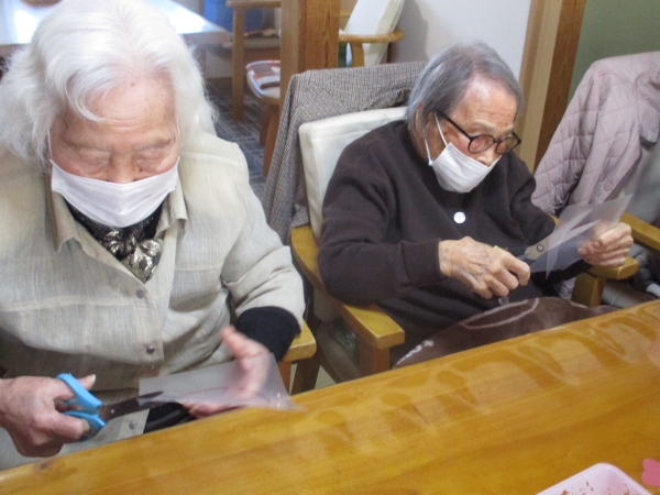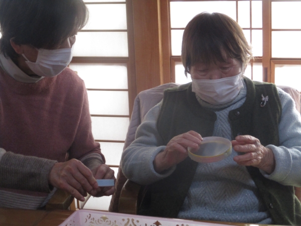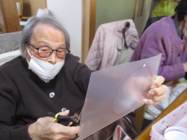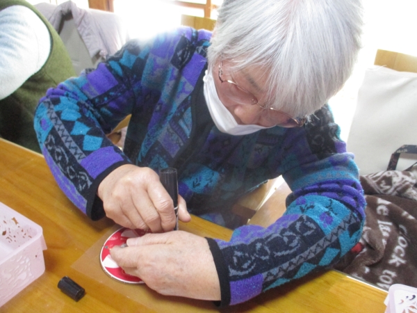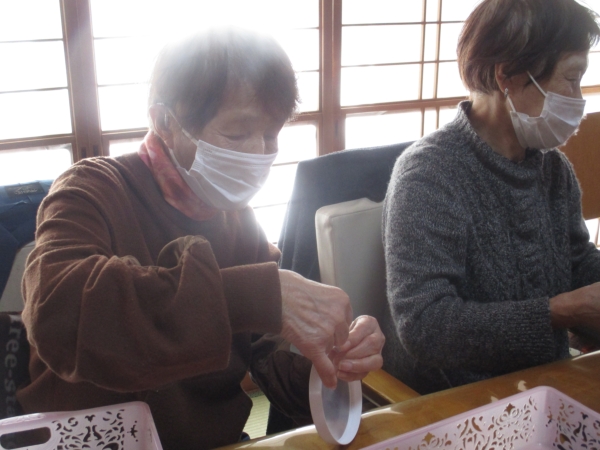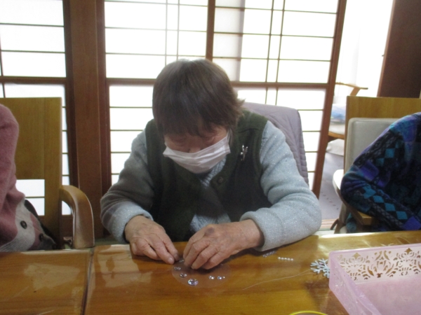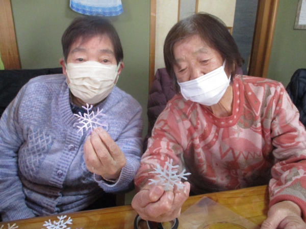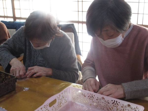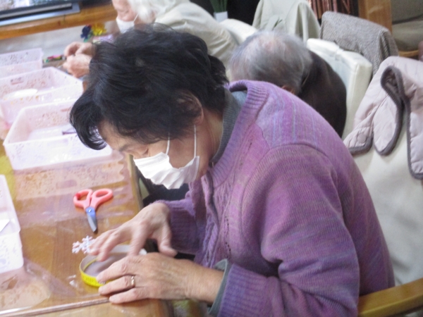 皆さん、雪の結晶が引き立つようにと集中して丁寧に貼っています