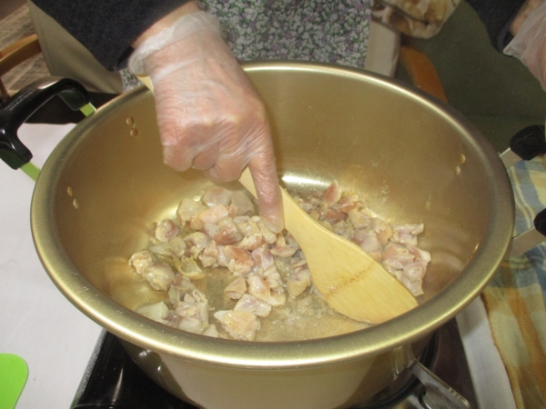 野菜が煮えたら、シチューの素と牛乳を加え、コトコト煮込みます