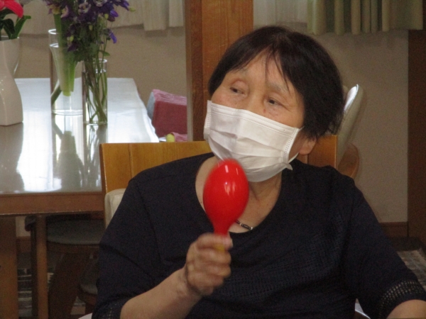 タンバリンで音楽に合わせてるんるん (音符)るんるん (音符)るんるん (音符)