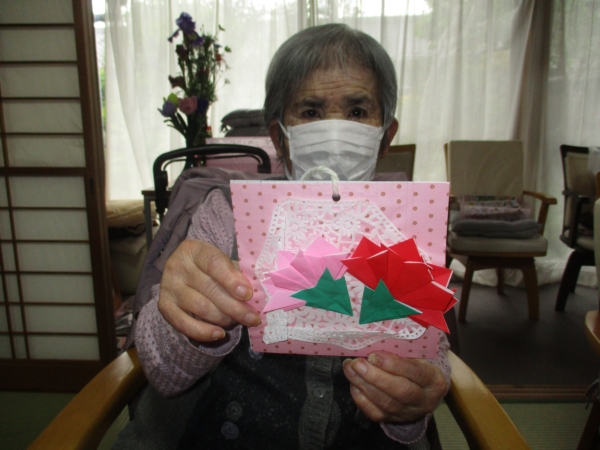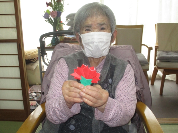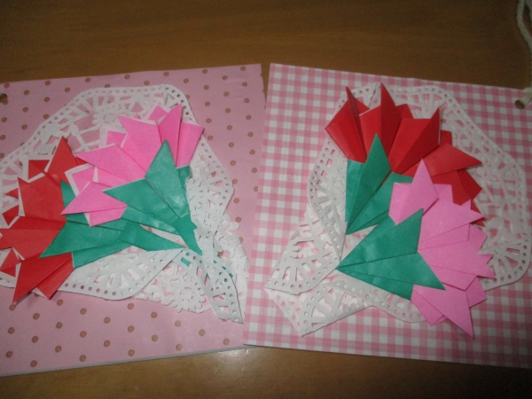 今日は、折り紙を使ってこちらの↑カーネーションの壁飾りを作っていきますよ~