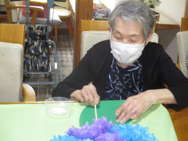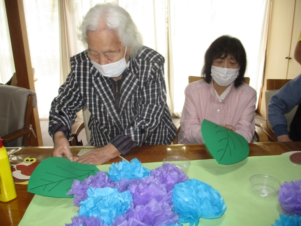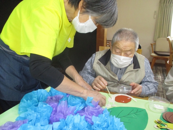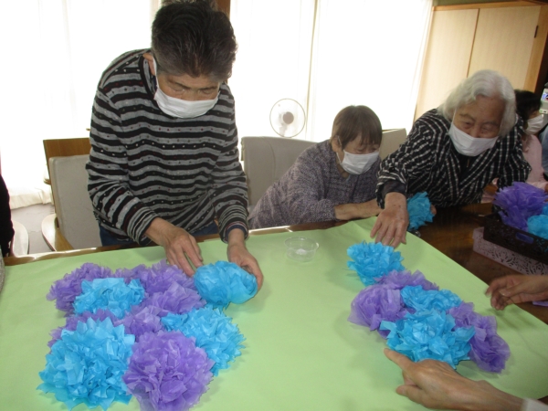 今日は、以前より取り掛かっていた紫陽花の壁画作りの完成にむけて