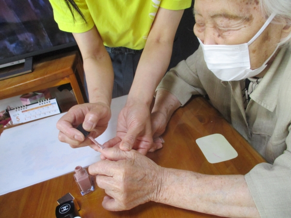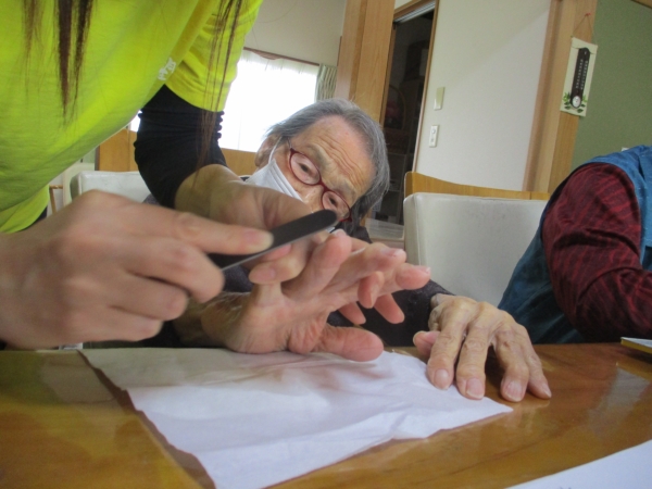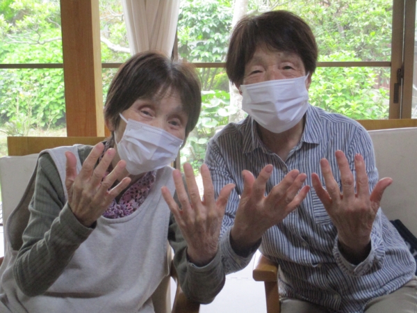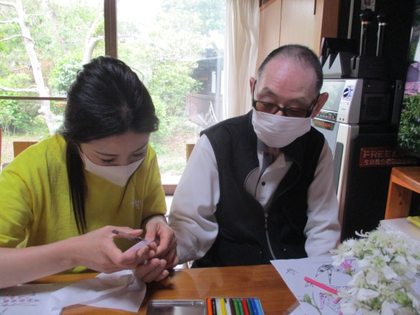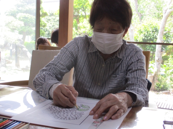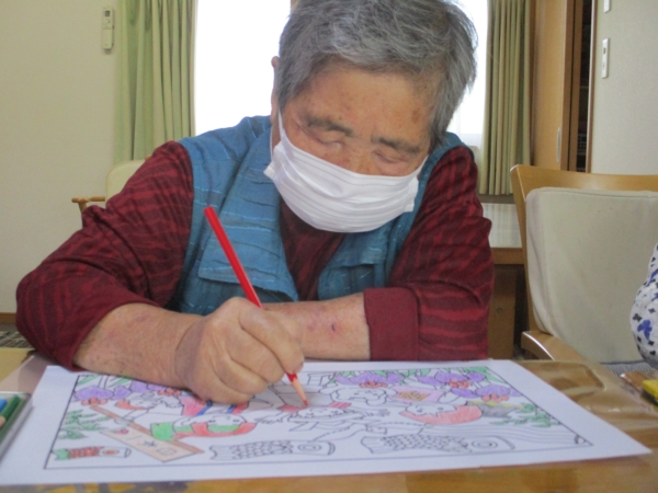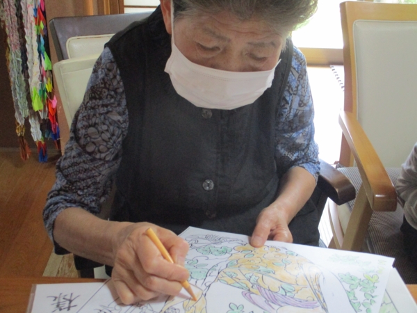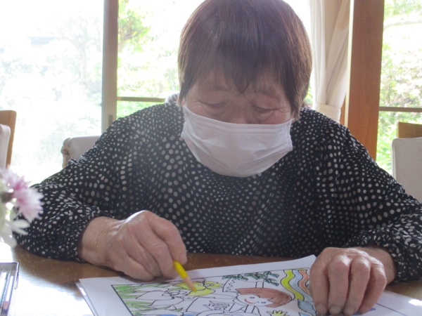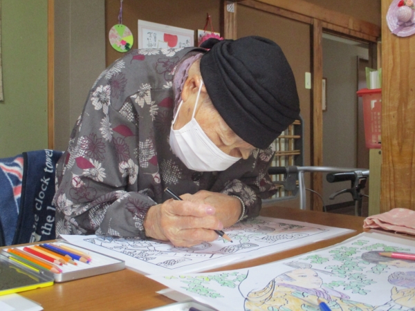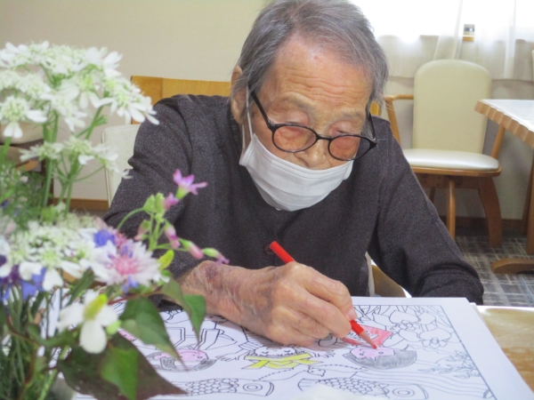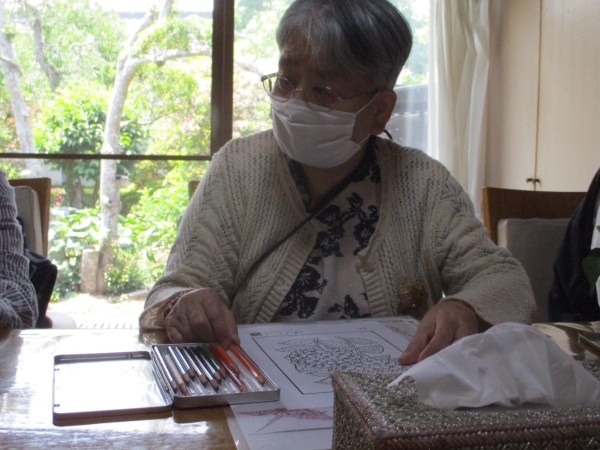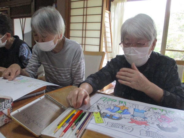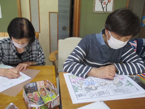と皆様仲良く塗り絵をたのしんでいます手 (チョキ)
