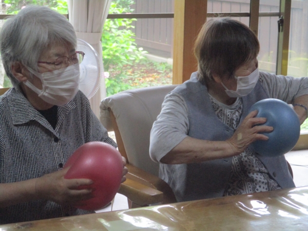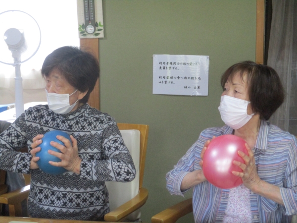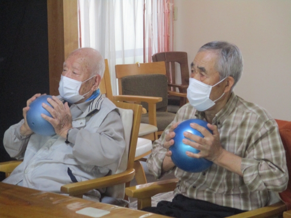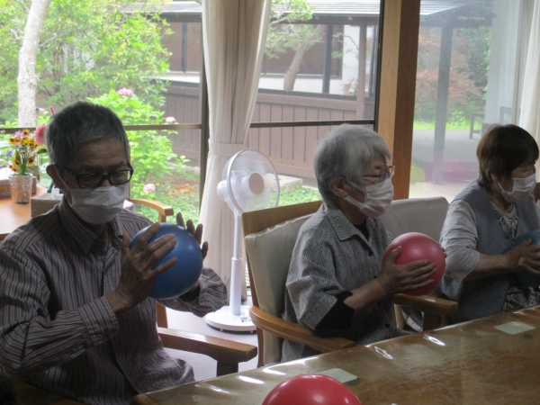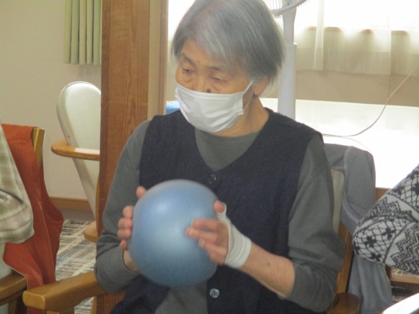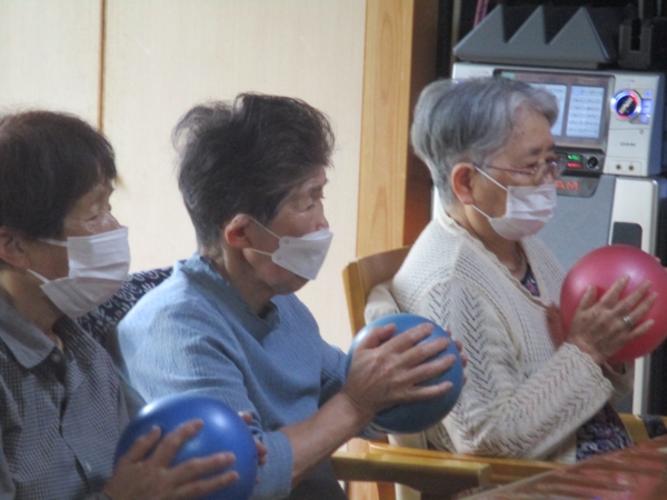 最後は、『りんごの唄』の曲に合わせてボール体操ですよ~