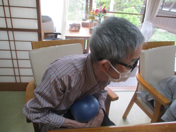 次は、ボールを膝の上に乗せ、お辞儀するように