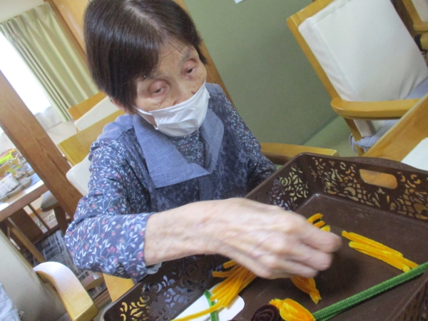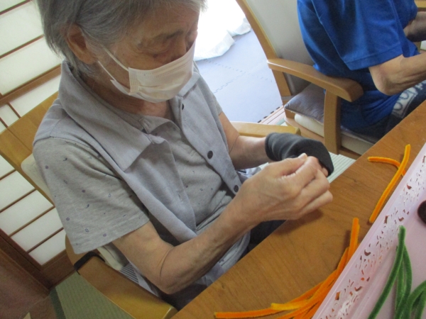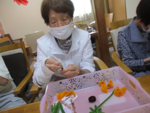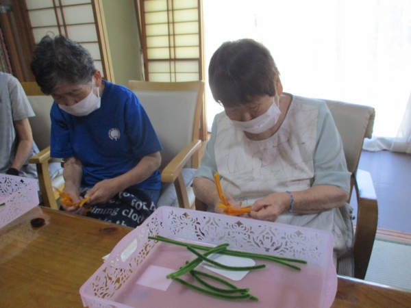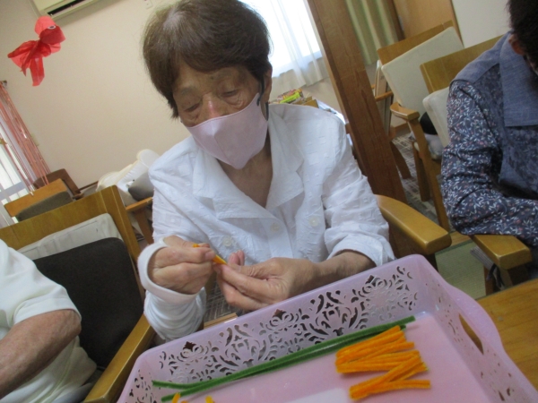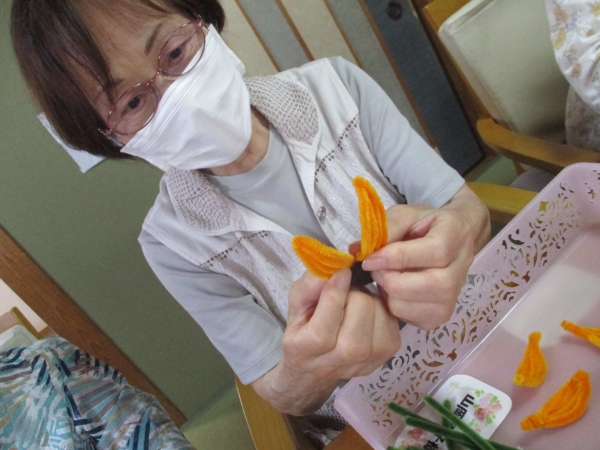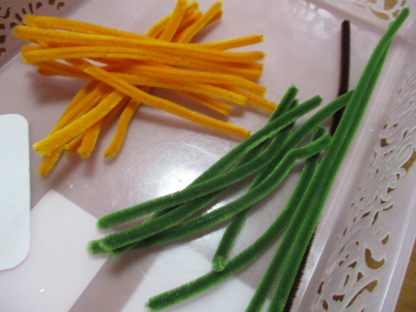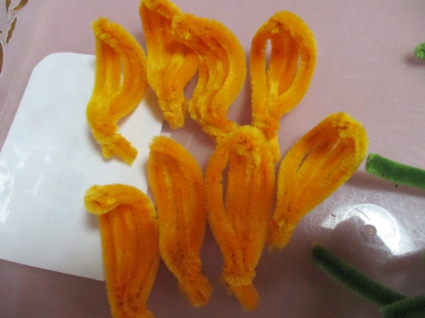 折ったオレンジのモールを花の形にしていきますうれしい顔ハートたち (複数ハート)