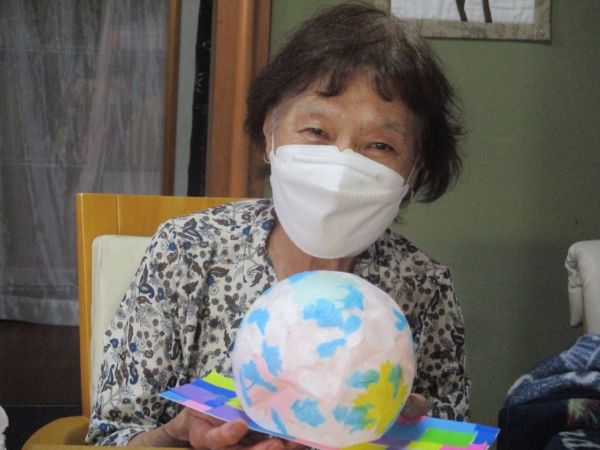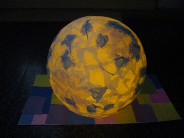 和紙で作った球体を台紙に貼り付け、ランプシェードの完成となります手 (チョキ)